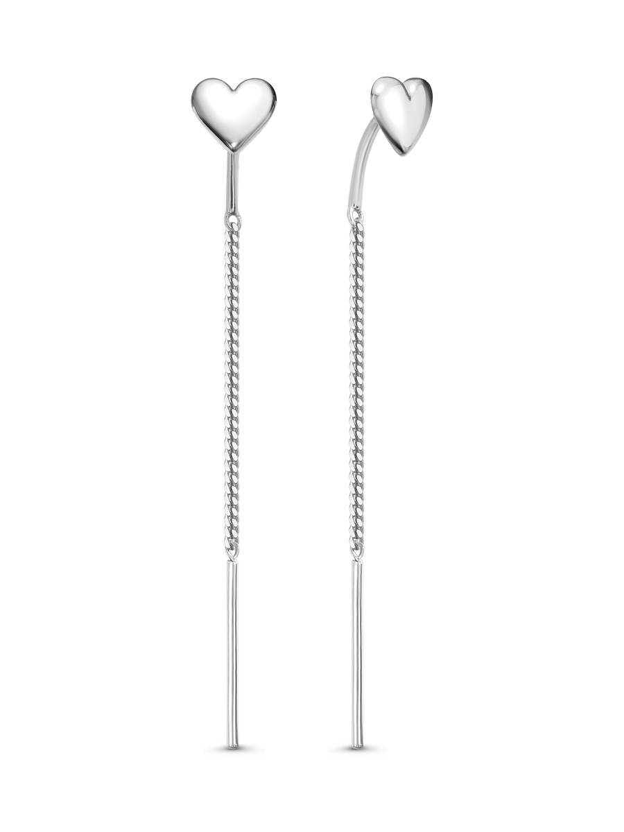 Серьги протяжки выполнены из серебра 925 пробы с родиевым покрытием. Характеристики. Общая высота серьги 57 мм. Высота сердечка 6,5 мм, ширина 7 мм, глубина 1,4 мм. Длина цепочки сзади 30 мм. Толщина цепочки 1,2 мм. Длина палочки 15 мм, диаметр 0,9 мм. Рабочая зона крючка 4 мм, толщина 1 мм. Берегите изделие от воздействия влаги, любых спиртосодержащих растворов и жидкостей, а также парфюма. Для ухода и чистки желательно использовать специальные салфетки для серебра. Приятным дополнением к ювелирному украшению является фирменная упаковка. Значения веса и габаритов в характеристиках примерные и могут отличаться от фактических.