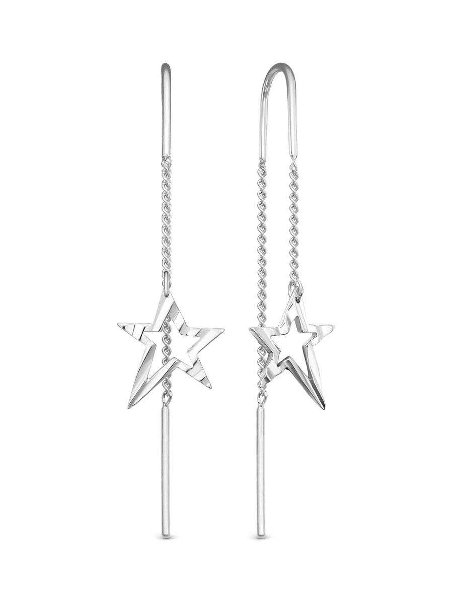 Серьги протяжки выполнены из серебра 925 пробы с родиевым покрытием. Характеристики. Общая высота серьги 57 мм. Высота передней части вместе с подвеской 40 мм. Высота звезды 14,7 мм, ширина 13 мм, глубина 1,1 мм. Длина цепочки сзади 30 мм. Длина цепочки над звездой 15 мм. Толщина цепочки 1,2 мм. Длина палочки 15 мм, диаметр 0,9 мм. Внутренний диаметр петли 5,8 мм, толщина крючка 0,9 мм. Отличным дополнением к серьгам будет подвеска арт. 3-00-661-00р. Берегите изделие от воздействия влаги, любых спиртосодержащих растворов и жидкостей, а также парфюма. Для ухода и чистки желательно использовать специальные салфетки для серебра. Приятным дополнением к ювелирному украшению является фирменная упаковка. Значения веса и габаритов в характеристиках примерные и могут отличаться от фактических.