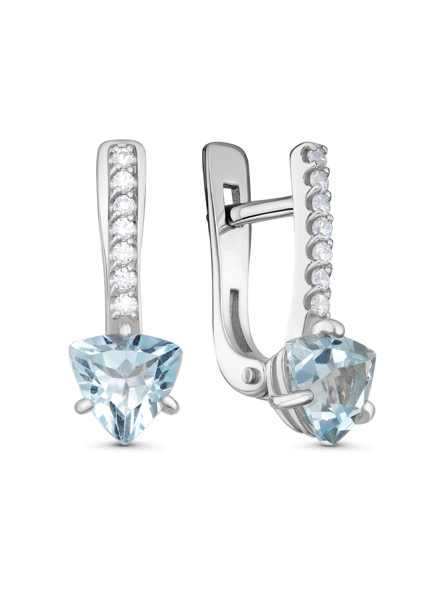 Серьги выполнены из серебра 925 пробы с родиевым покрытием. Характеристики. Вставка 2 натуральных топаза 6 мм огранка триллион, 14 недрагоценных бесцветных фианитов 1,25 мм огранка круг. Высота серьги 17 мм, ширина 6 мм. Ширина дорожки из фианитов 1,7 мм. Рабочая зона штифта 6 мм, размер занижения штифта 2,5 мм. Отличным дополнением к серьгам будет кольцо арт. 1-04-150-08р. Берегите изделие от воздействия влаги, любых спиртосодержащих растворов и жидкостей, а также парфюма. Для ухода и чистки желательно использовать специальные салфетки для серебра. Приятным дополнением к ювелирному украшению является фирменная упаковка. Значения веса и габаритов в характеристиках примерные и могут отличаться от фактических.
