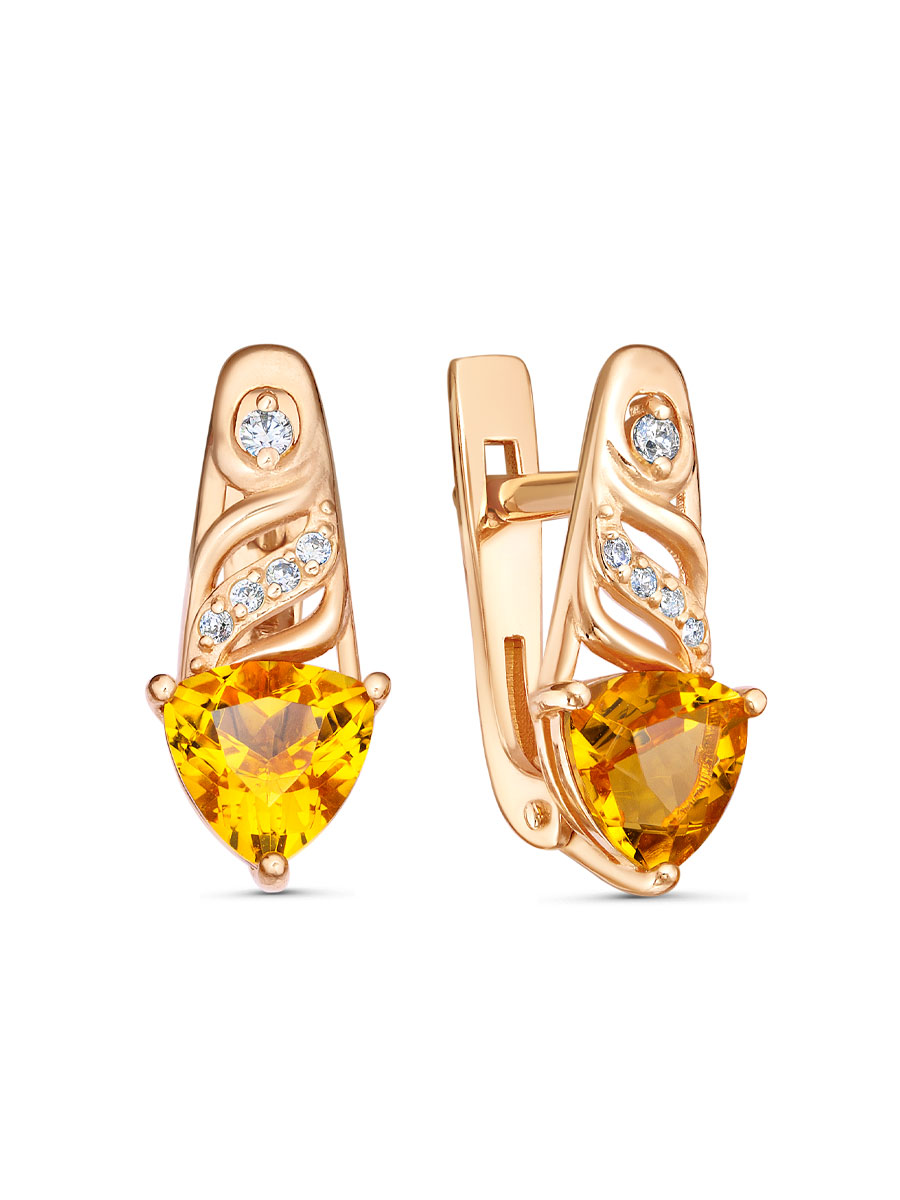Серьги выполнены из серебра 925 пробы с золотым покрытием. Характеристики. Вставка 2 натуральных цитрина 6х6 мм цвет жёлтый огранка триллион, 2 недрагоценных бесцветных фианита 1,5 мм огранка круг, 8 недрагоценных бесцветных фианитов 1 мм огранка круг. Высота серьги 16 мм, ширина 7 мм. Рабочая зона штифта 7 мм, размер занижения штифта 3 мм. Берегите изделие от воздействия влаги, любых спиртосодержащих растворов и жидкостей, а также парфюма. Для ухода и чистки желательно использовать специальные салфетки для серебра. Приятным дополнением к ювелирному украшению является фирменная упаковка. Значение веса и габаритов в характеристиках примерные и могут отличаться от фактических.