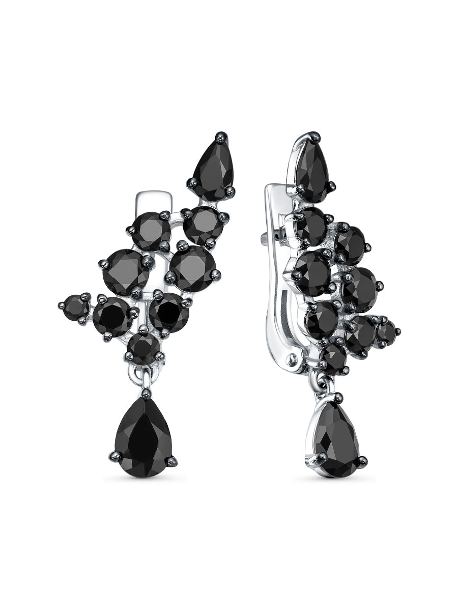 Серьги выполнены из серебра 925 пробы с родиевым покрытием. Характеристики. Вставка 2 натуральных шпинели 6х4 мм цвет чёрный огранка груша, 2 натуральных шпинели 5х3 мм цвет чёрный огранка груша, 4 натуральных шпинели 3,5 мм цвет чёрный огранка круг, 8 натуральных шпинели 3 мм цвет чёрный огранка круг, 2 натуральных шпинели 2,5 мм цвет чёрный огранка круг, 2 натуральных шпинели 2 мм цвет чёрный огранка круг. Общая высота серьги 27 мм, высота без подвески 19 мм, ширина 12 мм. Рабочая зона штифта 6 мм. Декоративная часть поднимается вверх над крючком на 7 мм. Отличным дополнением к серьгам будет кольцо арт. 1-04-175-11р. Берегите изделие от воздействия влаги, любых спиртосодержащих растворов и жидкостей, а также парфюма. Для ухода и чистки желательно использовать специальные салфетки для серебра. Приятным дополнением к ювелирному украшению является фирменная упаковка. Значение веса и габаритов в характеристиках примерные и могут отличаться от фактических.