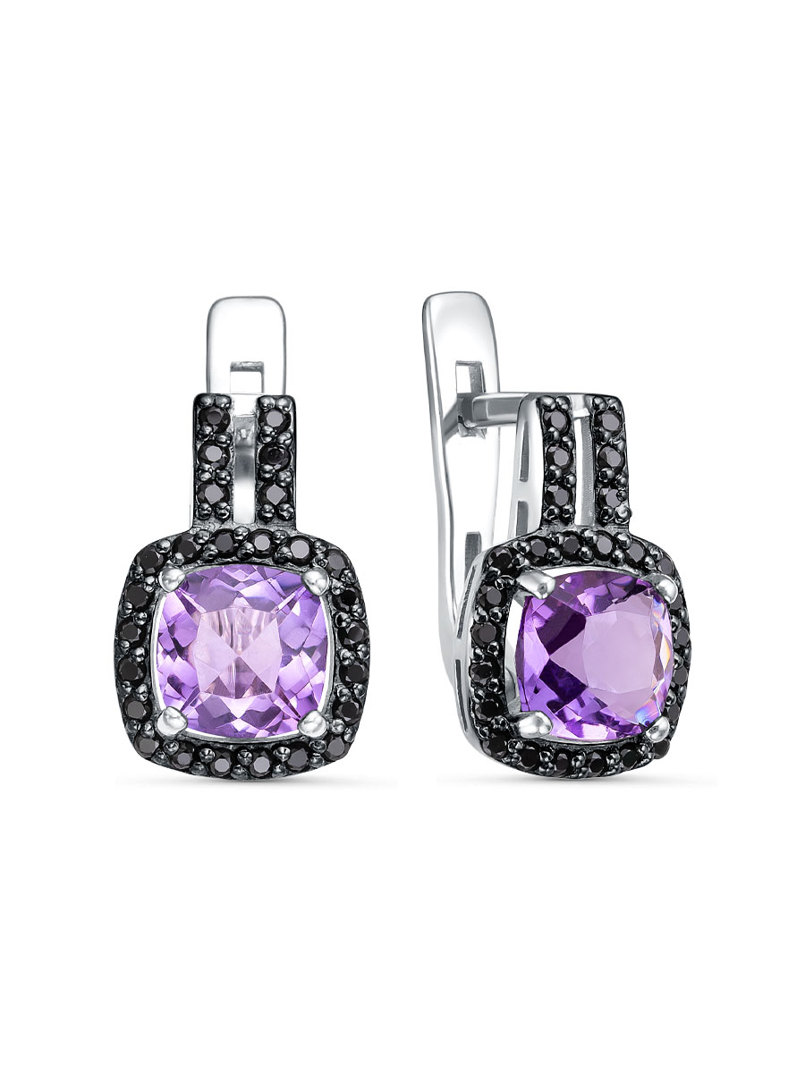 Серьги выполнены из серебра 925 пробы с родиевым покрытием. Характеристики. Вставка 2 натуральных аметиста 6х6 мм цвет фиолетовый огранка кушон, 52 натуральных шпинели 1 мм цвет чёрный огранка круг. Высота серьги 13,5 мм, ширина 9 мм. Рабочая зона штифта 5,5 мм. Отличным дополнением к серьгам будет кольцо арт.1-04-186-13р. Берегите изделие от воздействия влаги, любых спиртосодержащих растворов и жидкостей, а также парфюма. Для ухода и чистки желательно использовать специальные салфетки для серебра. Приятным дополнением к ювелирному украшению является фирменная упаковка. Значение веса и габаритов в характеристиках примерные и могут отличаться от фактических.