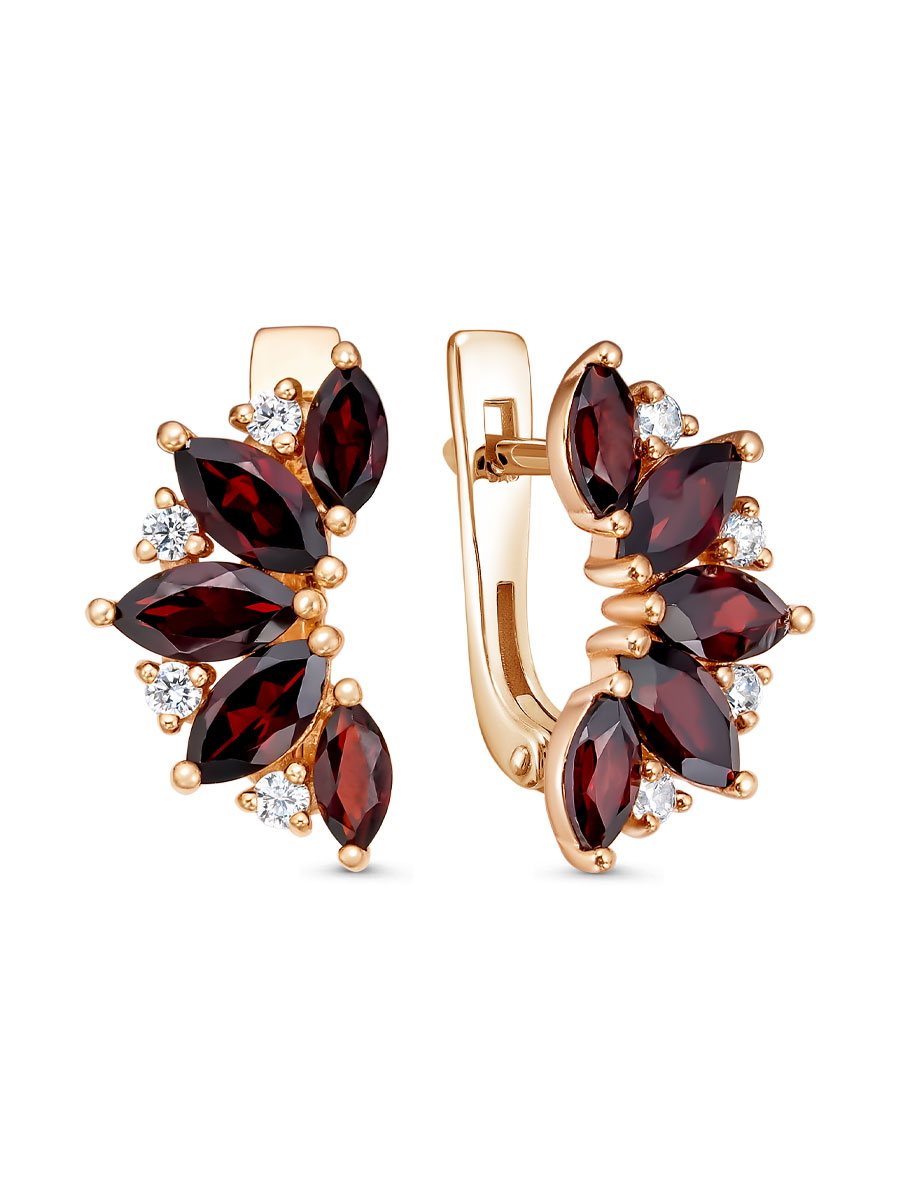 Серьги выполнены из серебра 925 пробы с золотым покрытием. Характеристики. Вставка 4 натуральных граната 5х2,5 мм огранка маркиз, 6 натуральных гранатов 6х3 мм огранка маркиз, 8 недрагоценных бесцветных фианитов 1,75 мм огранка круг. Высота серьги 16,5 мм, ширина 9,5 мм. Замок английский. Рабочая зона штифта 6,5 мм, размер занижения штифта 2 мм. Берегите изделие от воздействия влаги, любых спиртосодержащих растворов и жидкостей, а также парфюма. Для ухода и чистки желательно использовать специальные салфетки для серебра. Приятным дополнением к ювелирному украшению является фирменная упаковка. Значение веса и габаритов в характеристиках примерные и могут отличаться от фактических.