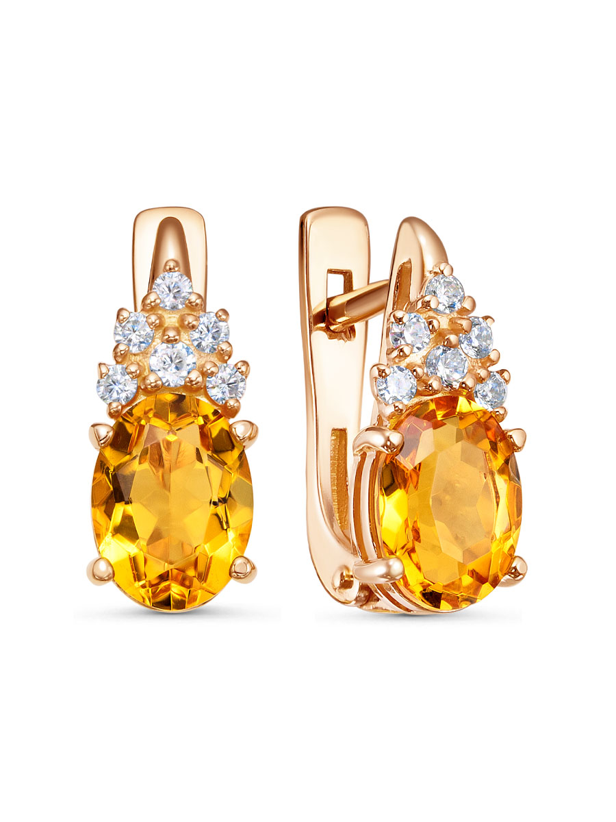 Серьги выполнены из серебра 925 пробы с золотым покрытием. Характеристики. Вставка 2 натуральных цитрина 8х6 мм огранка овал, 2 недрагоценных бесцветных фианита 1,75 мм огранка круг, 10 недрагоценных бесцветных фианитов 1,5 мм огранка круг. Высота серьги 15 мм, ширина 6,2 мм. Рабочая зона штифта 7 мм, размер занижения штифта 2 мм. Отличным дополнением к серьгам будет кольцо арт. 1-04-207-34з. Берегите изделие от воздействия влаги, любых спиртосодержащих растворов и жидкостей, а также парфюма. Для ухода и чистки желательно использовать специальные салфетки для серебра. Приятным дополнением к ювелирному украшению является фирменная упаковка. Значение веса и габаритов в характеристиках примерные и могут отличаться от фактических.
