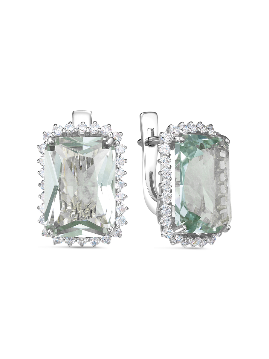 Серьги выполнены из серебра 925 пробы с родиевым покрытием. Характеристики. Вставка 2 натуральных празиолита 14х10 мм огранка октагон, 56 недрагоценных бесцветных фианитов 1,5 мм огранка круг. Высота декоративной части 17,5 мм, ширина 12,5 мм. Рабочая зона штифта 6,5 мм, размер занижения штифта 2 мм. Отличным дополнением к серьгам будут кольцо арт.1-04-256-31р и подвеска арт. 3-04-256-21р.. Берегите изделие от воздействия влаги, любых спиртосодержащих растворов и жидкостей, а также парфюма. Для ухода и чистки желательно использовать специальные салфетки для серебра. Приятным дополнением к ювелирному украшению является фирменная упаковка. Значения веса и габаритов в характеристиках являются примерными и могут отличаться от фактических.