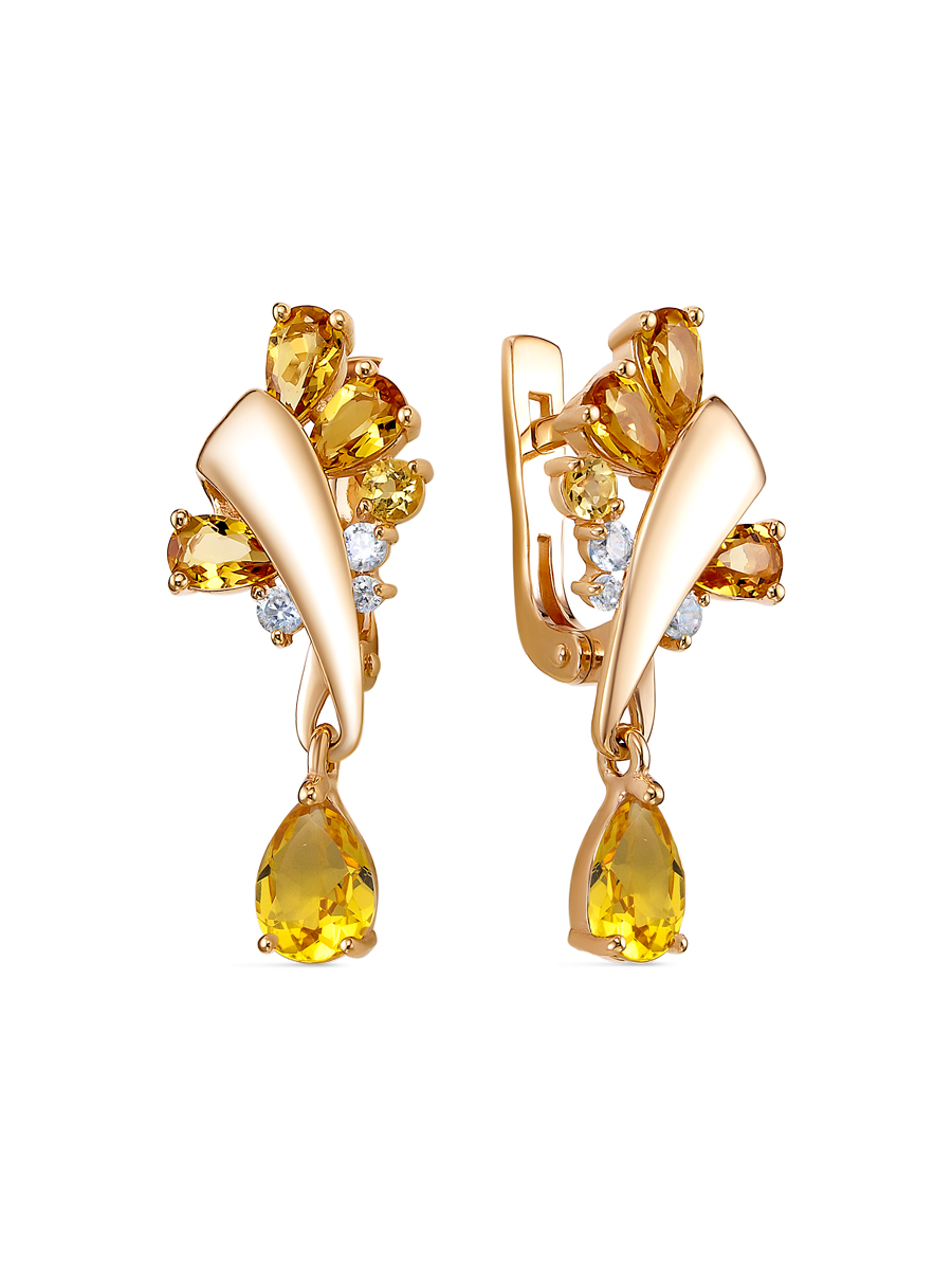 Серьги с натуральными цитринами выполнены из серебра 925 пробы с золотым покрытием. Характеристики. Вставка 6 натуральных цитринов 5х3мм цвет жёлтый огранка груша, 2 натуральных цитрина 2,5мм цвет жёлтый огранка круг, 4 недрагоценных бесцветных фианита 2мм огранка круг, 2 недрагоценных бесцветных фианита 1,5мм огранка круг, 2 натуральных цитрина 7х5мм цвет жёлтый огранка груша. Общая высота серьги 27мм, высота подвесной части 9мм, ширина 11,4мм, глубина 3,6мм. Рабочая зона штифта 6,7мм, размер занижения штифта 4мм. Отличным дополнением к серьгам будут кольцо арт.1-04-278-34з и колье арт.5-04-278-34з. Берегите изделие от воздействия влаги, любых спиртосодержащих растворов и жидкостей, а также парфюма. Для ухода и чистки желательно использовать специальные салфетки для серебра. Приятным дополнением к ювелирному украшению является фирменная упаковка. Значение веса и габаритов в характеристиках примерные и могут отличаться от фактических.