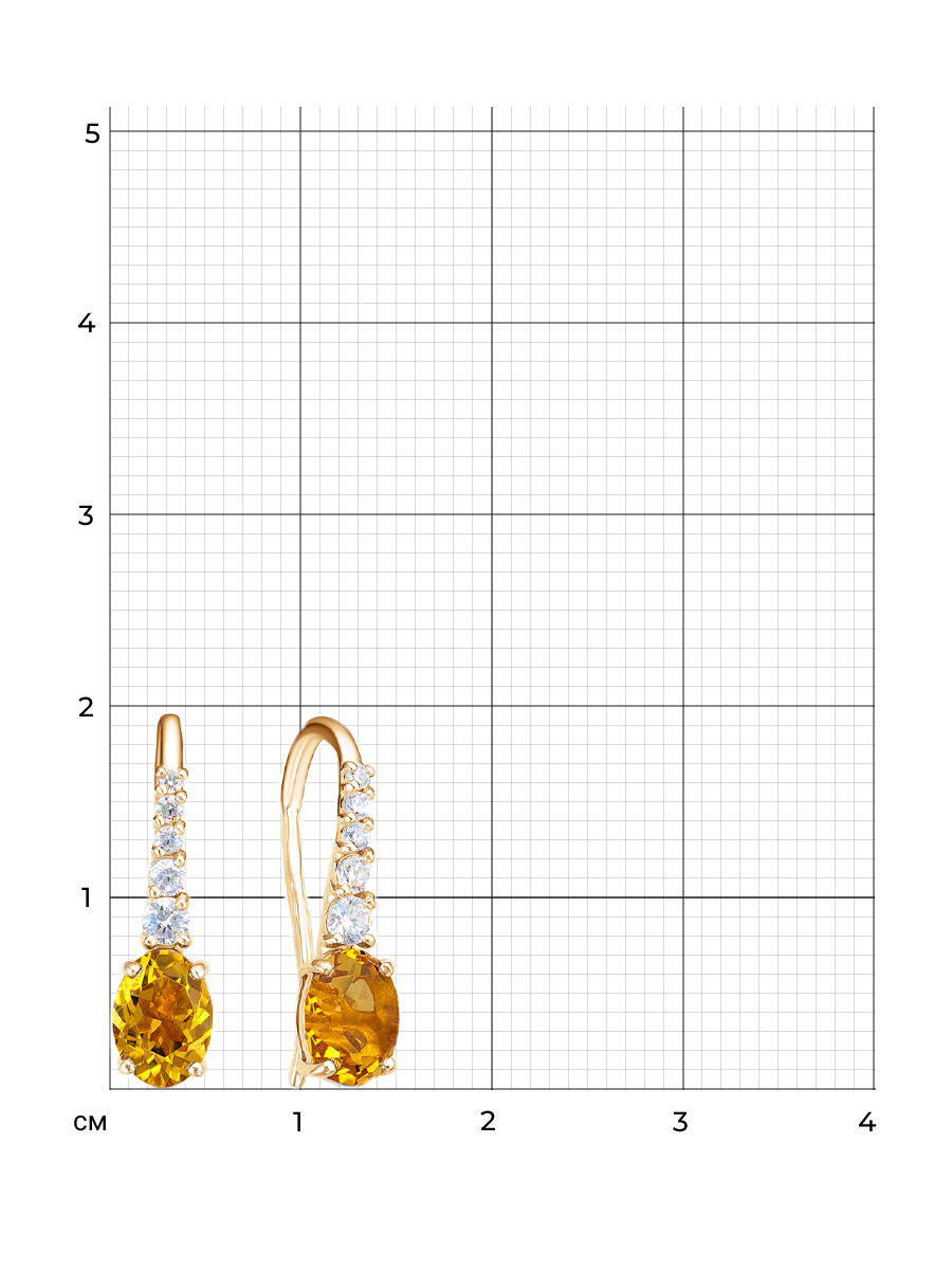 Серьги с натуральными цитринами и фианитами выполнены из серебра 925 пробы с золотым покрытием. Характеристики. Вставка 2 натуральных цитрина 7х5 мм цвет жёлтый огранка овал, 2 недрагоценных бесцветных фианита 1,25мм огранка круг, 4 недрагоценных бесцветных фианита 1,5 мм огранка круг, 2 недрагоценных бесцветных фианита 2 мм огранка круг, 2 недрагоценных бесцветных фианита 2,5 мм огранка круг. Высота серьги 18 мм. Внутренний радиус петли 5,5 мм. Берегите изделие от воздействия влаги, любых спиртосодержащих растворов и жидкостей, а также парфюма. Для ухода и чистки желательно использовать специальные салфетки для серебра. Приятным дополнением к ювелирному украшению является фирменная упаковка. Значение веса и габаритов в характеристиках примерные и могут отличаться от фактических.