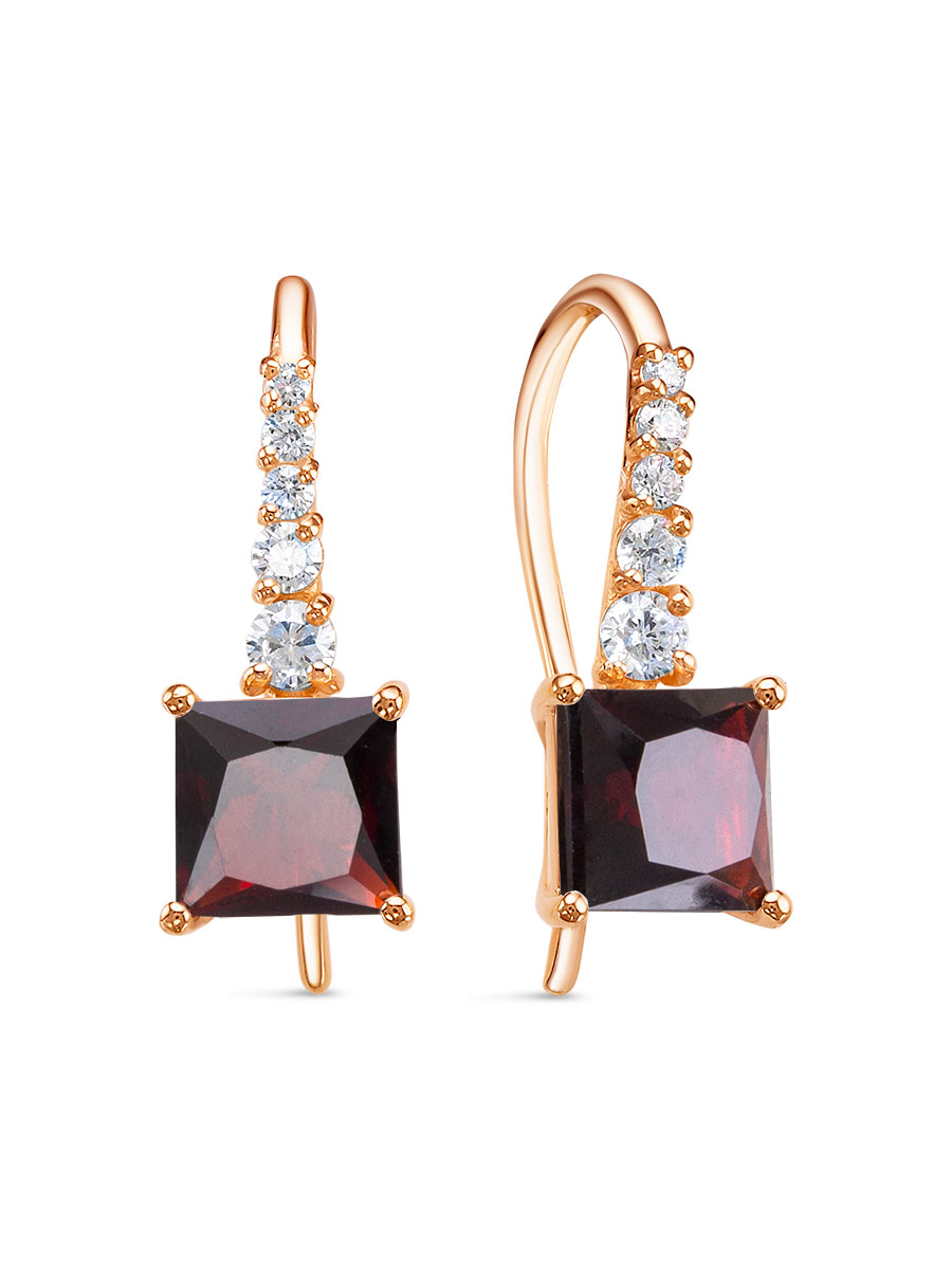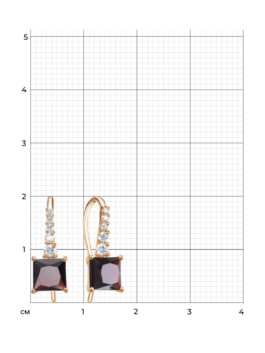 Серьги выполнены из серебра 925 пробы с золотым покрытием. Характеристики. Вставка 2 натуральных граната 6х6мм цвет гранат огранка квадрат, 2 недрагоценных бесцветных фианита 1,25мм огранка круг, 4 недрагоценных бесцветных фианита 1,5мм огранка круг, 2 недрагоценных бесцветных фианита 2мм огранка круг, 2 недрагоценных бесцветных фианита 2,5мм огранка круг. Высота серьги 18,5мм, ширина 7мм, глубина вместе с камнем 4,5мм. Длина крючка 21мм. Внутренний диаметр петли 6,3мм. Отличным дополнением к серьгам будут кольцо арт.1-04-290-03з и подвеска арт.3-04-290-03з. Берегите изделие от воздействия влаги, любых спиртосодержащих растворов и жидкостей, а также парфюма. Для ухода и чистки желательно использовать специальные салфетки для серебра. Приятным дополнением к ювелирному украшению является фирменная упаковка. Значение веса и габаритов в характеристиках примерные и могут отличаться от фактических.