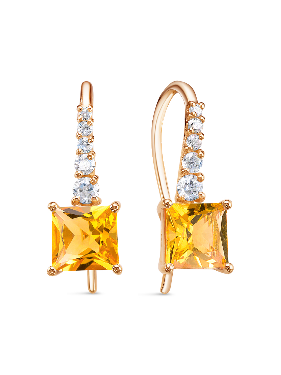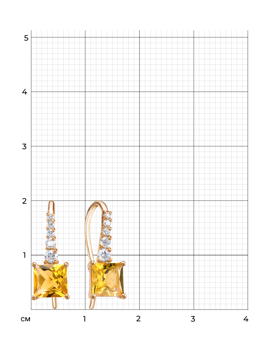 Серьги выполнены из серебра 925 пробы с золотым покрытием. Характеристики. Вставка 2 натуральных цитрина 6х6мм цвет жёлтый огранка квадрат, 2 недрагоценных бесцветных фианита 1,25мм огранка круг, 4 недрагоценных бесцветных фианита 1,5мм огранка круг, 2 недрагоценных бесцветных фианита 2мм огранка круг, 2 недрагоценных бесцветных фианита 2,5мм огранка круг. Высота серьги 18,5мм, ширина 7мм, глубина вместе с камнем 4,5мм. Длина крючка 21мм. Внутренний диаметр петли 6,3мм. Отличным дополнением к серьгам будут кольцо арт.1-04-290-34з и подвеска арт.3-04-290-34з. Берегите изделие от воздействия влаги, любых спиртосодержащих растворов и жидкостей, а также парфюма. Для ухода и чистки желательно использовать специальные салфетки для серебра. Приятным дополнением к ювелирному украшению является фирменная упаковка. Значение веса и габаритов в характеристиках примерные и могут отличаться от фактических.