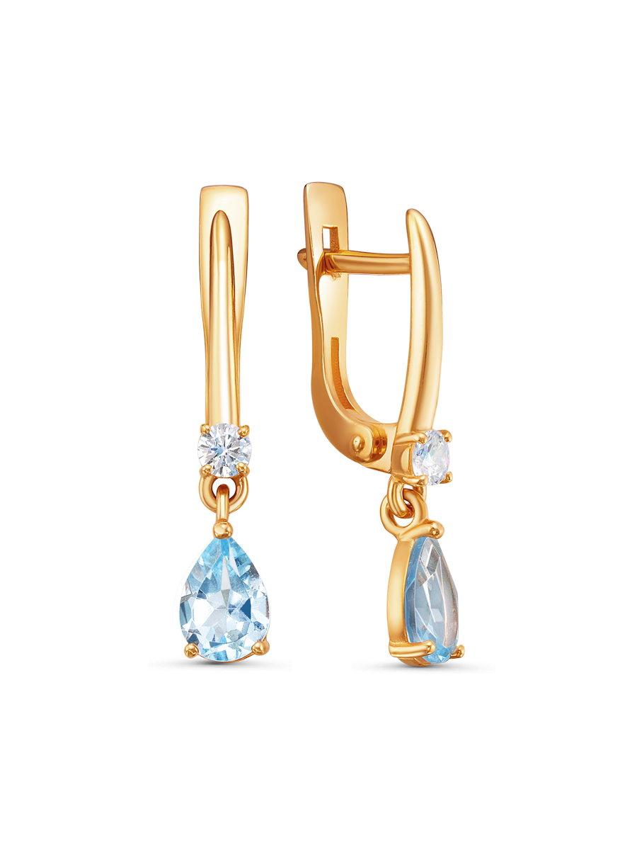 Серьги выполнены из серебра 925 пробы с золотым покрытием. Характеристики. Вставка 2 натуральных топаза 7х5мм цвет Скай огранка груша, 2 недрагоценных бесцветных фианита 3мм огранка круг. Общая высота серьги 26мм, высота подвесной части 10мм. Рабочая зона штифта 6,3мм, размер занижения штифта 2мм. Берегите изделие от воздействия влаги, любых спиртосодержащих растворов и жидкостей, а также парфюма. Для ухода и чистки желательно использовать специальные салфетки для серебра. Приятным дополнением к ювелирному украшению является фирменная упаковка. Значение веса и габаритов в характеристиках являются примерными и могут отличаться от фактических.