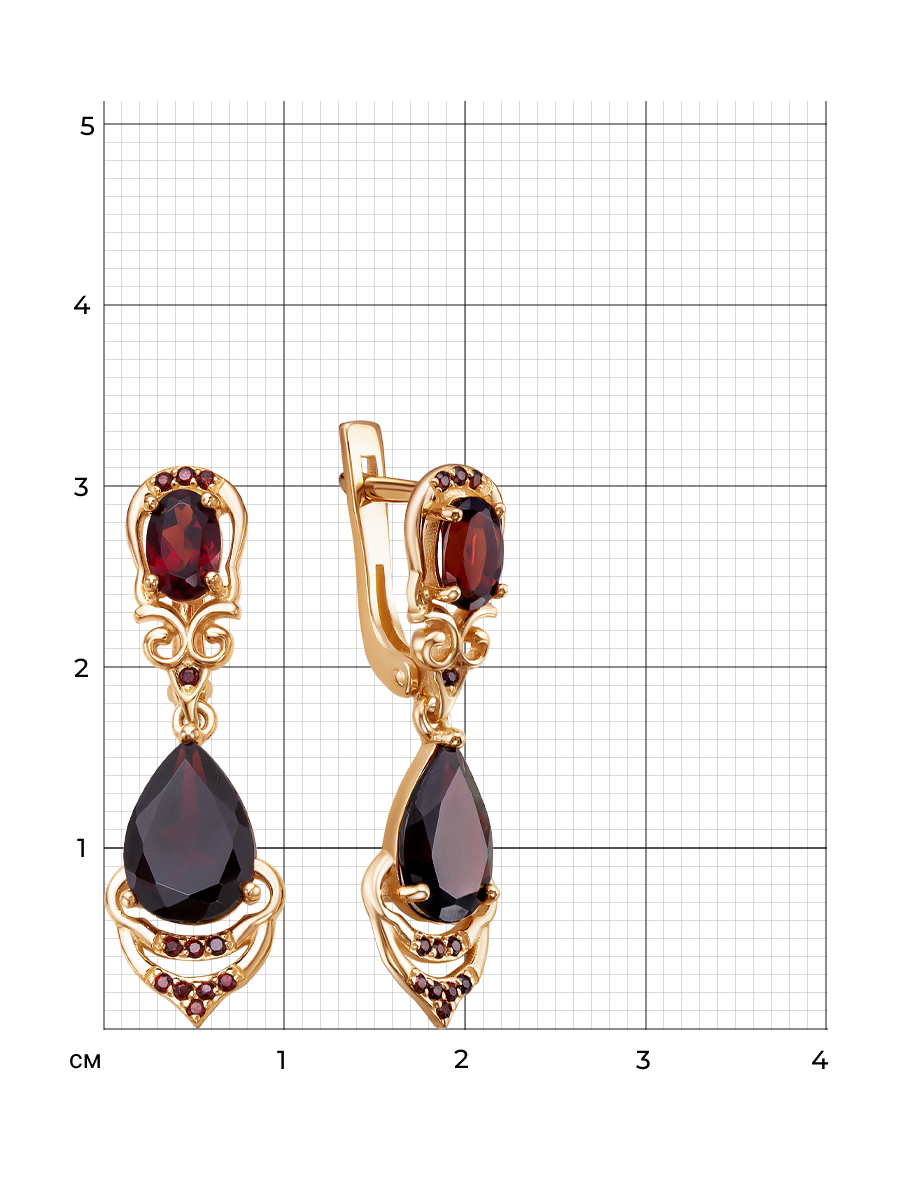 Серьги выполнены из серебра 925 пробы с золотым покрытием и оксидированием. Характеристики. Вставка 2 натуральных граната 10х7мм цвет гранат огранка груша, 2 натуральных граната 6х4мм огранка овал, 24 натуральных граната 1 мм огранка круг. Общая высота серьги 31мм, высота подвесной части 18мм, ширина 9,5мм. Рабочая зона штифта 6,3мм, размер занижения штифта 1мм. Отличным дополнением к серьгам будет кольцо арт. 1-04-353-03з. Берегите изделие от воздействия влаги, любых спиртосодержащих растворов и жидкостей, а также парфюма. Для ухода и чистки желательно использовать специальные салфетки для серебра. Приятным дополнением к ювелирному украшению является фирменная упаковка. Значения веса и габаритов в характеристиках примерные и могут отличаться от фактических.