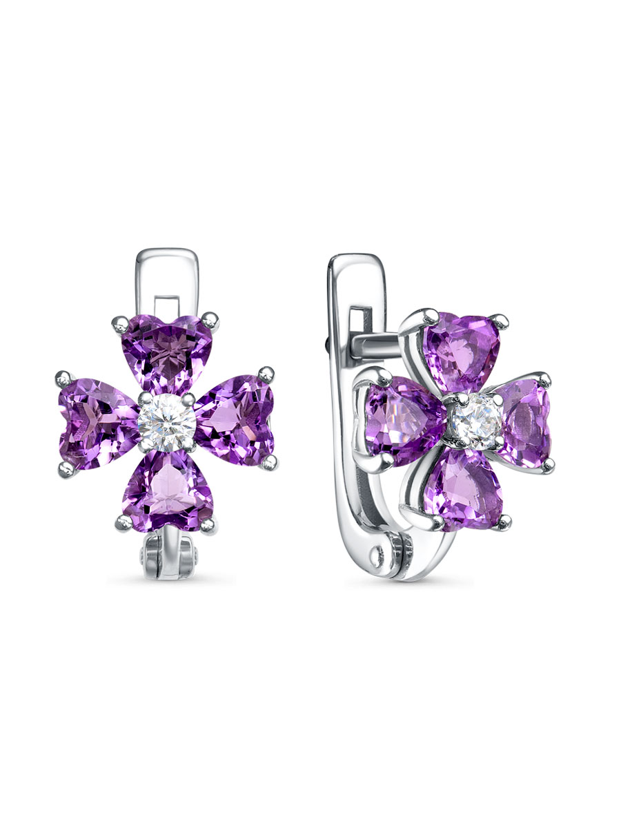 Серьги выполнены из серебра 925 пробы с родиевым покрытием. Характеристики. Вставка 8 натуральных аметистов 4х4 мм цвет фиолетовый огранка сердце, 2 недрагоценных бесцветных фианита 2,5 мм огранка круг. Высота серьги 11,5 мм. Высота цветка 9,5 мм, ширина 9,5 мм, глубина 4,3 мм. Рабочая зона штифта 6 мм. Отличным дополнением к серьгам будет подвеска арт.3-04-422-13р. Берегите изделие от воздействия влаги, любых спиртосодержащих растворов и жидкостей, а также парфюма. Для ухода и чистки желательно использовать специальные салфетки для серебра. Приятным дополнением к ювелирному украшению является фирменная упаковка. Значение веса и габаритов в характеристиках примерные и могут отличаться от фактических.