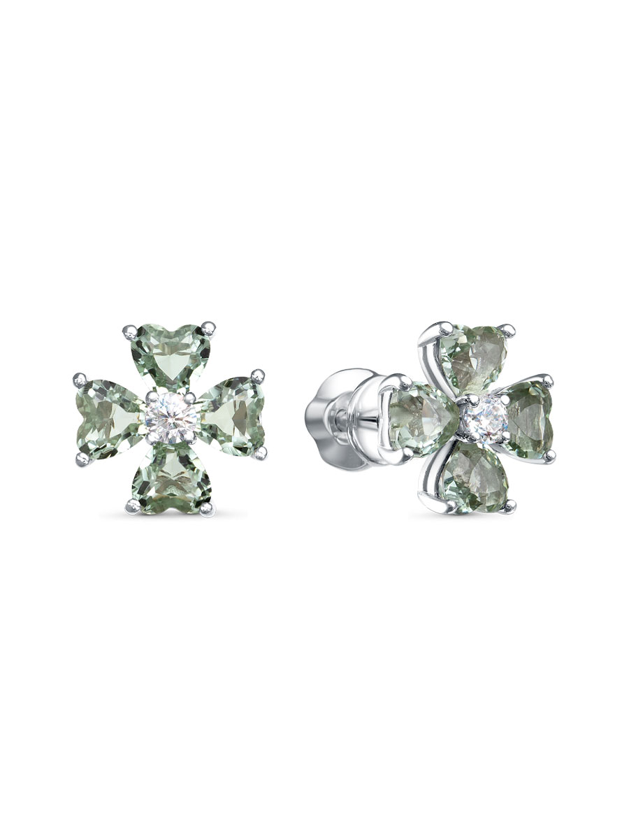 Серьги выполнены из серебра 925 пробы с родиевым покрытием. Характеристики. Вставка 8 натуральных празиолитов 4х4 мм огранка сердце, 2 недрагоценных бесцветных фианита 2,5 мм огранка круг. Высота серьги 9,7 мм, ширина 9,7 мм, глубина 4,5 мм. Замок винтовой. Рабочая зона штифта 4,5 мм. Толщина штифта 1,3 мм. Отличным дополнением к серьгам будет подвеска арт. 3-04-422-21р. Берегите изделие от воздействия влаги, любых спиртосодержащих растворов и жидкостей, а также парфюма. Для ухода и чистки желательно использовать специальные салфетки для серебра. Приятным дополнением к ювелирному украшению является фирменная упаковка. Значение веса и габаритов в характеристиках примерные и могут отличаться от фактических.