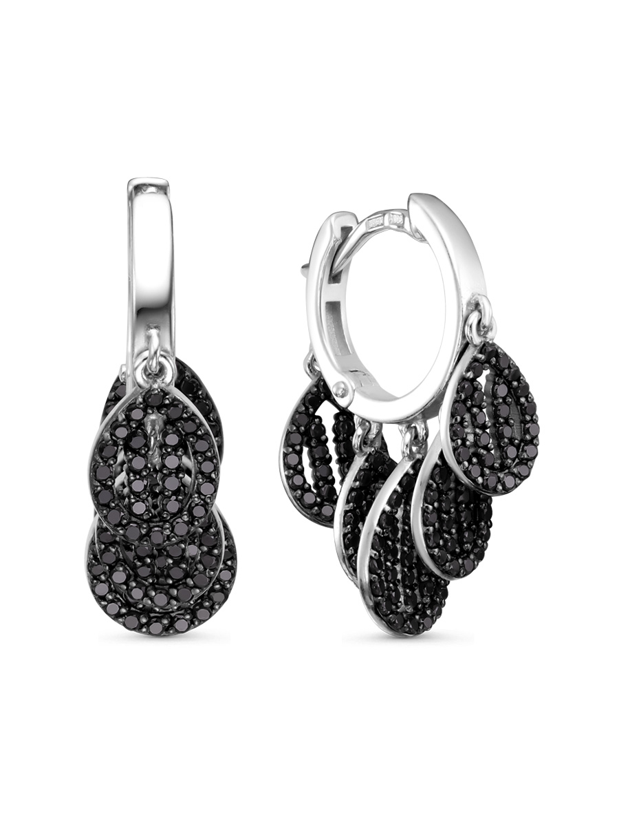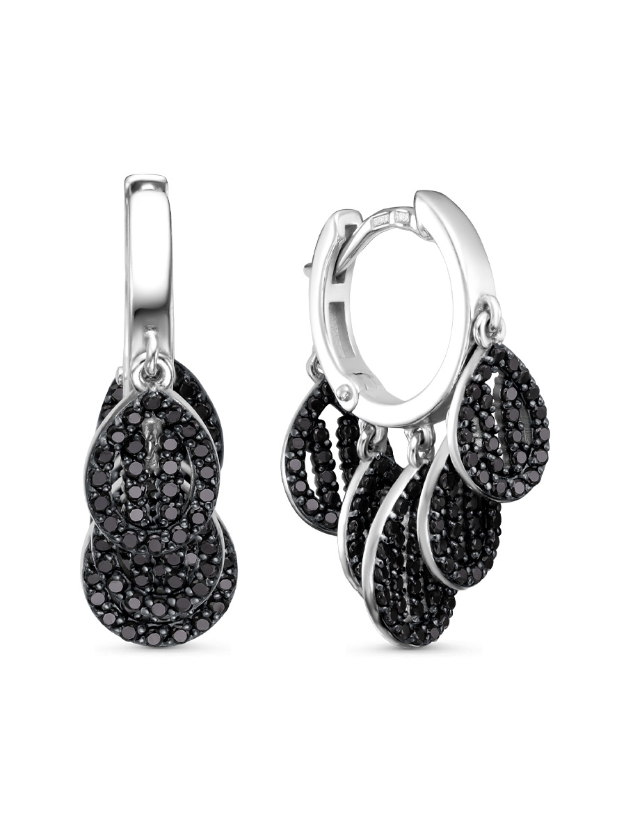 Серьги выполнены из серебра 925 пробы с родиевым покрытием. Характеристики. Вставка 258 натуральных шпинелей 1 мм цвет чёрный огранка круг. Общая высота серьги 25,5 мм. Высота без подвесок 12,3 мм, ширина 2,2 мм. Высота маленьких подвесок без учёта соединительного колечка 9,2 мм, ширина 6,5 мм. Высота большой подвески без учёта соединительного колечка 10,7 мм, ширина 7,8 мм. Замок английский. Рабочая зона штифта 6 мм, размер занижения штифта 1 мм. Толщина штифта 1,2х1 мм. Отличным дополнением к серьгам будет кольцо арт. 1-04-731-11р. Берегите изделие от воздействия влаги, любых спиртосодержащих растворов и жидкостей, а также парфюма. Для ухода и чистки желательно использовать специальные салфетки для серебра. Приятным дополнением к ювелирному украшению является фирменная упаковка. Значение веса и габаритов в характеристиках примерные и могут отличаться от фактических.