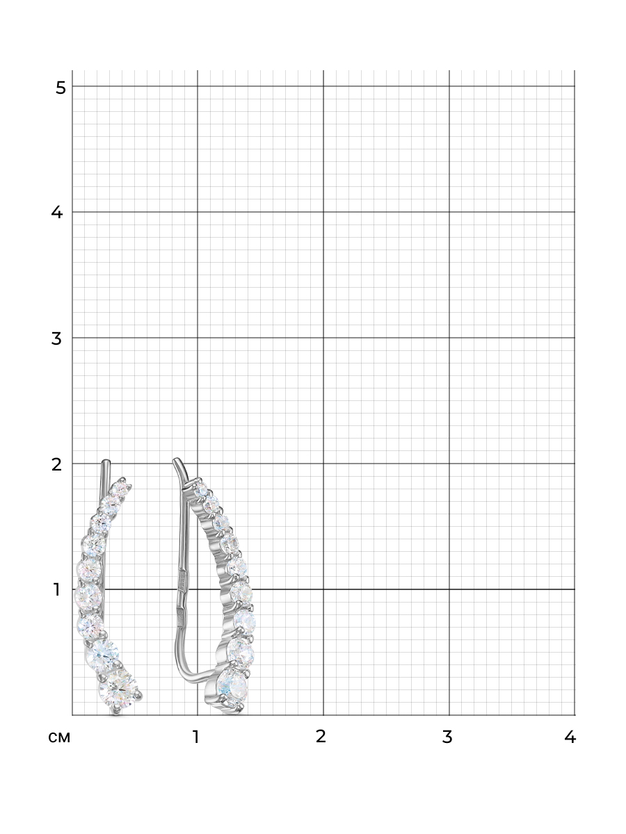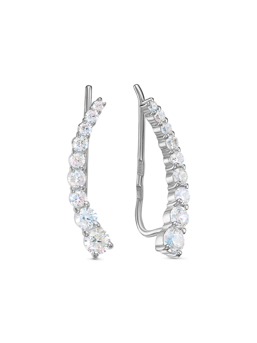 Каффы выполнены из серебра 925 пробы с родиевым покрытием. Характеристики. Вставка 2 бесцветных недрагоценных фианита 3мм огранка круг, 2 бесцветных недрагоценных фианита 2,5мм огранка круг, 4 бесцветных недрагоценных фианита 1,75мм огранка круг, 4 бесцветных недрагоценных фианита 1,5мм огранка круг, 2 бесцветных недрагоценных фианита 1,25мм огранка круг. Высота серьги 18мм, ширина 5мм, глубина вместе с камнем 2,5мм. Рабочая зона штифта 4,5мм, толщина штифта 0,8мм. Берегите изделие от воздействия влаги, любых спиртосодержащих растворов и жидкостей, а также парфюма. Для ухода и чистки желательно использовать специальные салфетки для серебра. Приятным дополнением к украшению является фирменная упаковка. Значение веса и габаритов в характеристиках являются примерными и могут отличаться от фактических.