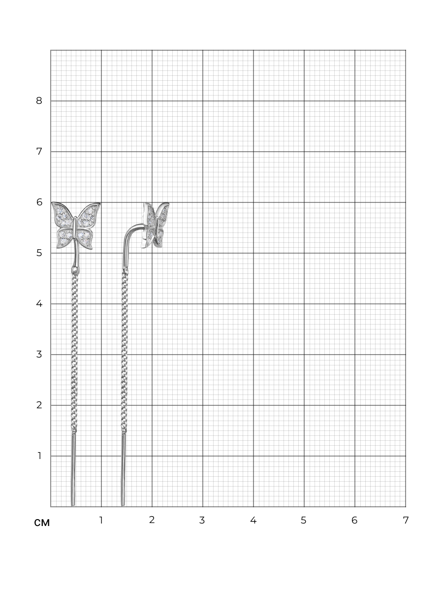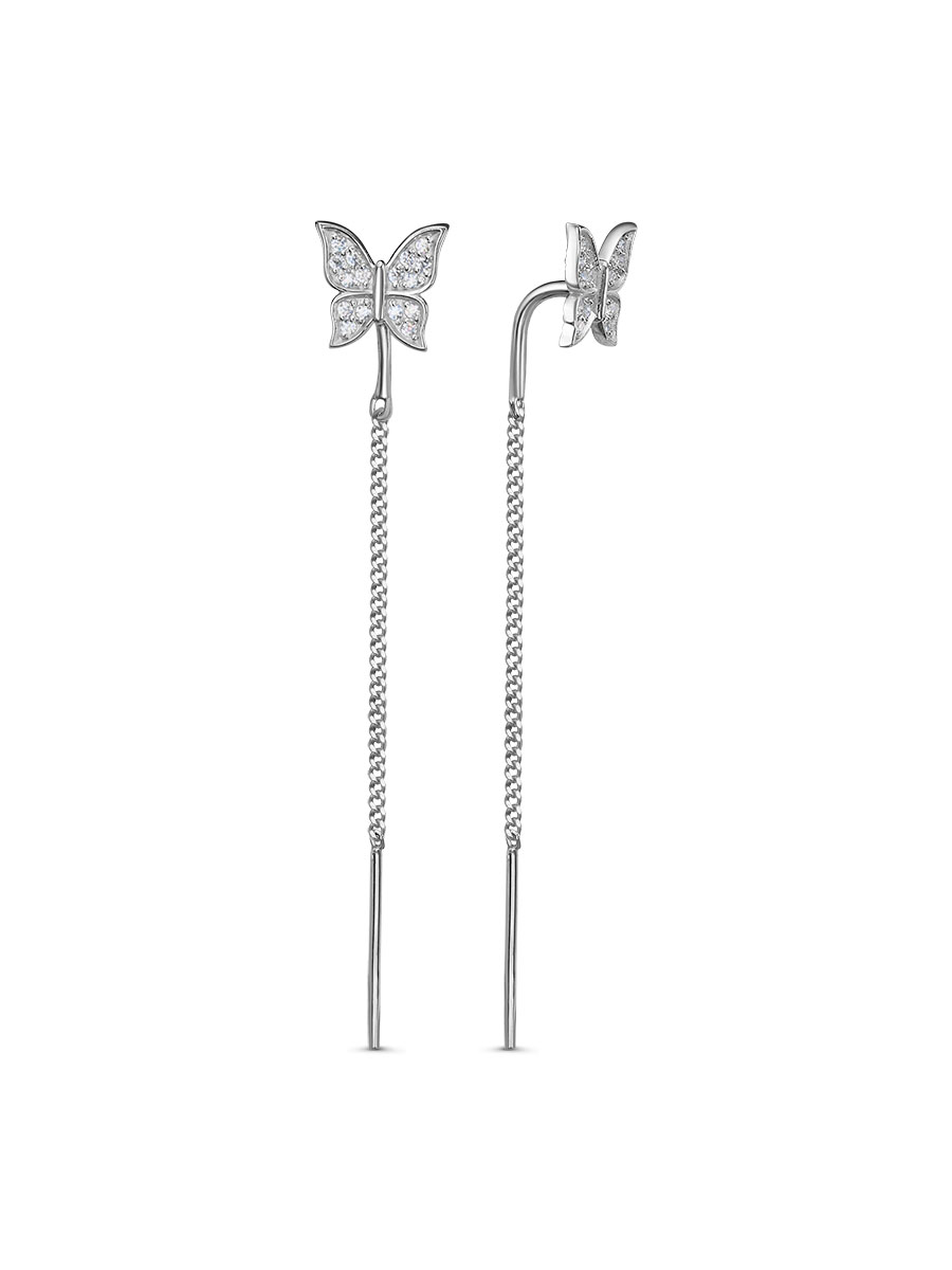 Серьги-протяжки выполнены из серебра 925 пробы с родиевым покрытием. Характеристики. Вставка 32 недрагоценных бесцветных фианитов 1мм огранка круг. Общая высота серьги 60мм. Высота бабочки 8,5мм, ширина 8,5мм. Без замка. Рабочая зона штифта 4,3мм, размер занижения штифта 4мм, толщина штифта 1,2мм. Толщина цепочки 1,2мм. Берегите изделие от воздействия влаги, любых спиртосодержащих растворов и жидкостей, а также парфюма. Для ухода и чистки желательно использовать специальные салфетки для серебра. Приятным дополнением к ювелирному украшению является фирменная упаковка. Значение веса и габаритов в характеристиках примерные и могут отличаться от фактических.
