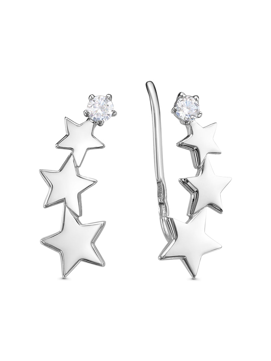 Серьги каффы выполнены из серебра 925 пробы с родиевым покрытием. Характеристики. Вставка 2 недрагоценных бесцветных фианита 2,5 мм огранка круг. Высота серьги 17,5 мм, ширина 7 мм. Высота крючка 16,5 мм. Рабочая зона штифта 4,5 мм. Толщина крючка 0,9 мм. Берегите изделие от воздействия влаги, любых спиртосодержащих растворов и жидкостей, а также парфюма. Для ухода и чистки желательно использовать специальные салфетки для серебра. Приятным дополнением к ювелирному украшению является фирменная упаковка. Значения веса и габаритов в характеристиках примерные и могут отличаться от фактических.