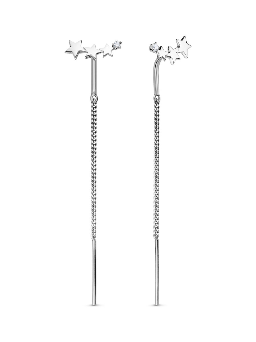 Серьги протяжки выполнены из серебра 925 пробы с родиевым покрытием. Характеристики. Вставка 2 недрагоценных бесцветных фианита 1,5 мм огранка круг. Общая высота серьги 59 мм, высота декоративной части 5 мм, ширина 12 мм, толщина цепочки с металлическим наконечником 1 мм. Длина палочки 15 мм. Рабочая зона штифта 4,5мм. Берегите изделие от воздействия влаги, любых спиртосодержащих растворов и жидкостей, а также парфюма. Для ухода и чистки желательно использовать специальные салфетки для серебра. Приятным дополнением к ювелирному украшению является фирменная упаковка. Значения веса и габаритов в характеристиках примерные и могут отличаться от фактических.
