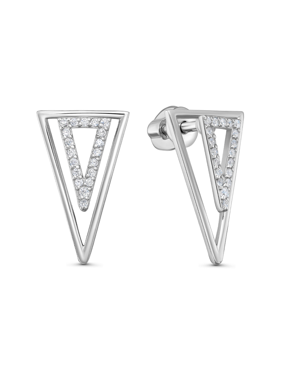 Серьги выполнены из серебра 925 пробы с родиевым покрытием. Характеристики. Вставка 36 недрагоценных бесцветных фианитов 1 мм огранка круг, 2 недрагоценных бесцветных фианита 1,25 мм огранка круг. Общая высота серьги 18 мм, ширина 11 мм. Высота маленького треугольника 11 мм, ширина 6,3 мм. Большой треугольник съёмный. Рабочая зона штифта со съёмной частью 4 мм, без неё 5 мм. Толщина штифта 1,2 мм. Берегите изделие от воздействия влаги, любых спиртосодержащих растворов и жидкостей, а также парфюма. Для ухода и чистки желательно использовать специальные салфетки для серебра. Приятным дополнением к ювелирному украшению является фирменная упаковка. Значение веса и габаритов в характеристиках примерные и могут отличаться от фактических.