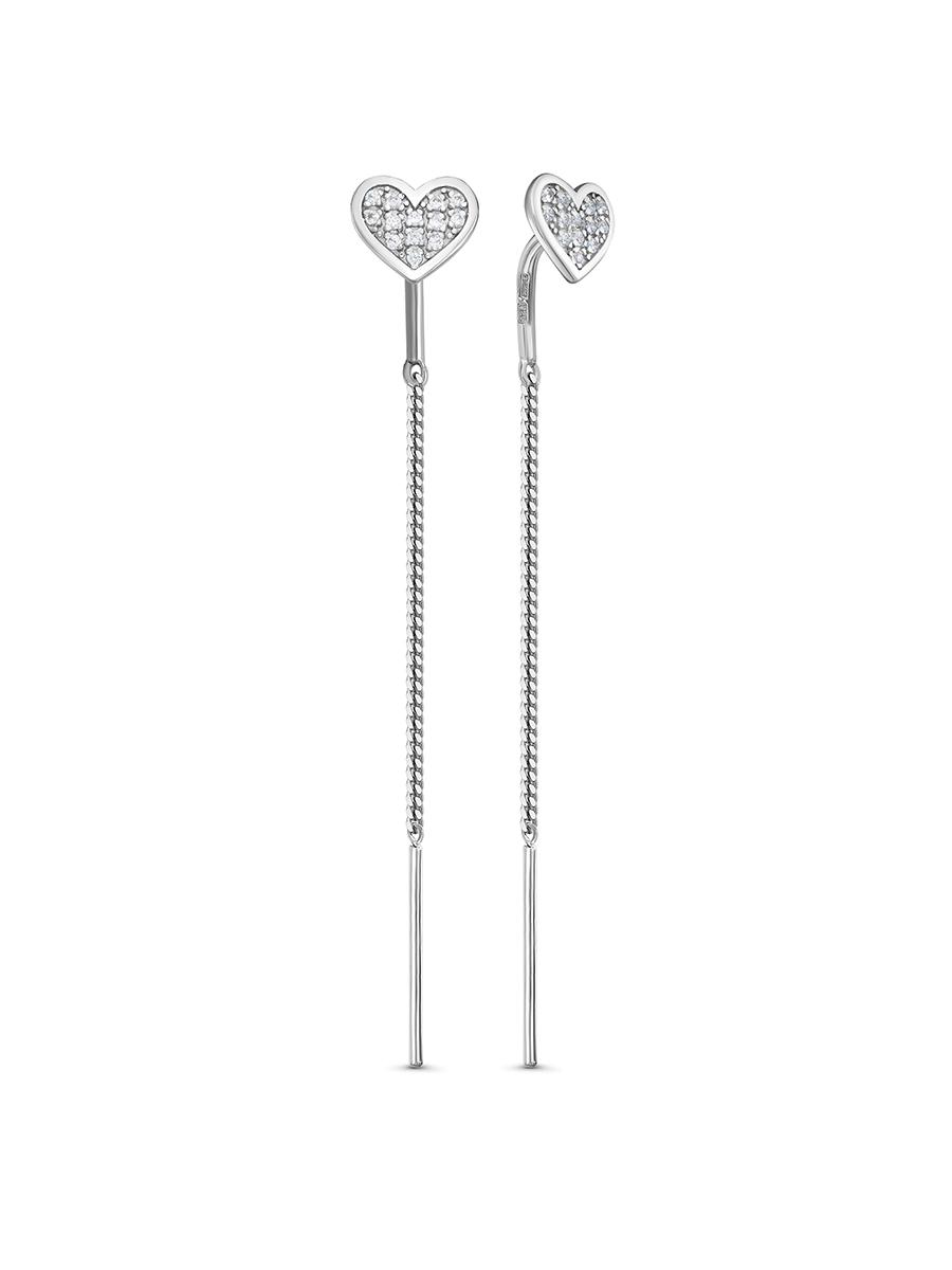 Серьги протяжки выполнены из серебра 925 пробы с родиевым покрытием. Характеристики. Вставка 26 недрагоценных бесцветных фианитов 1 мм огранка круг. Общая высота серьги 58 мм, высота декоративной части 7 мм, ширина 8,5 мм. Толщина цепочки с металлическим наконечником 0,9 мм. Длина палочки 15 мм. Рабочая зона штифта 5 мм, толщина 1,2 мм. Берегите изделие от воздействия влаги, любых спиртосодержащих растворов и жидкостей, а также парфюма. Для ухода и чистки желательно использовать специальные салфетки для серебра. Приятным дополнением к ювелирному украшению является фирменная упаковка. Значения веса и габаритов в характеристиках примерные и могут отличаться от фактических.