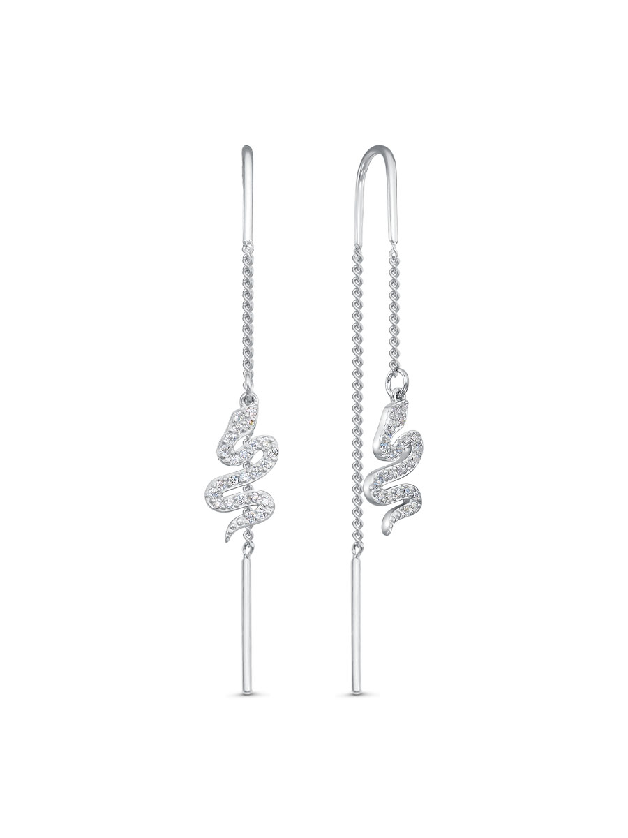 Серьги выполнены из серебра 925 пробы с родиевым покрытием. Характеристики. Вставка 48 недрагоценных бесцветных фианитов 1 мм огранка круг. Общая высота серьги 55 мм. Высота змеи 15 мм, ширина 7,5 мм. Длина палочки14,5 мм, толщина 0,8 мм. Толщина крючка 0,8 мм. Внутренний диаметр (рабочая зона штифта) 5,4 мм. Берегите изделие от воздействия влаги, любых спиртосодержащих растворов и жидкостей, а также парфюма. Для ухода и чистки желательно использовать специальные салфетки для серебра. Приятным дополнением к ювелирному украшению является фирменная упаковка. Значение веса и габаритов в характеристиках примерные и могут отличаться от фактических.