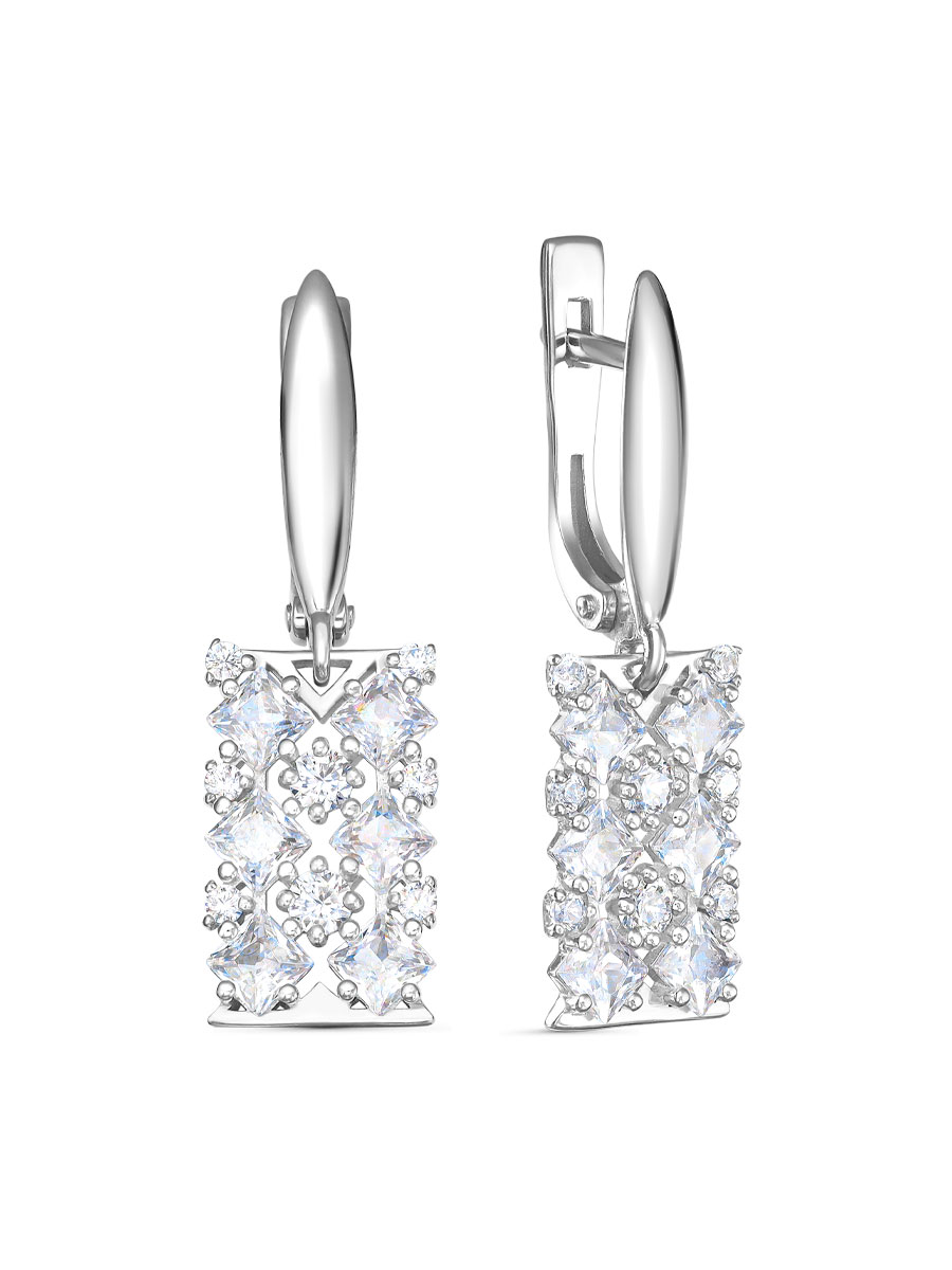 Серьги выполнены из серебра 925 пробы с родиевым покрытием. Характеристики. Вставка 12 недрагоценных бесцветных фианитов 3х3 мм огранка квадрат, 4 недрагоценных бесцветных фианита 2,5 мм огранка круг, 12 недрагоценных бесцветных фианитов 1,5 мм огранка круг. Общая высота серьги 30 мм, ширина верхушки 3 мм. Высота подвесной части 15 мм, ширина 9 мм, глубина 2 мм. Рабочая зона штифта 5,7 мм, размер занижения штифта 3 мм. Толщина штифта 1,3х0,9 мм. Берегите изделие от воздействия влаги, любых спиртосодержащих растворов и жидкостей, а также парфюма. Для ухода и чистки желательно использовать специальные салфетки для серебра. Приятным дополнением к ювелирному украшению является фирменная упаковка. Значения веса и габаритов в характеристиках примерные и могут отличаться от фактических.