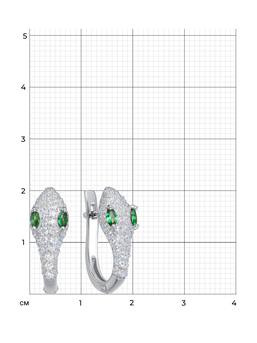 Серьги Змейка выполнено из серебра 925 пробы с родиевым покрытием. Характеристики. Вставка 46 недрагоценных бесцветных фианитов 1,5мм огранка круг, 16 недрагоценных бесцветных фианитов 1,25мм огранка круг, 34 недрагоценных бесцветных фианита 1мм огранка круг, 4 нано кристалла 4х2мм цвет изумруд огранка маркиз. Высота серьги 20мм, ширина 7,5мм, глубина 3,4мм. Рабочая зона штифта 5мм, размер занижения штифта 4мм. Отличным дополнением к серьгам будет кольцо арт.1-08-277-12р. Берегите изделие от воздействия влаги, любых спиртосодержащих растворов и жидкостей, а также парфюма. Для ухода и чистки желательно использовать специальные салфетки для серебра. Приятным дополнением к ювелирному украшению является фирменная упаковка. Значение веса и габаритов в характеристиках примерные и могут отличаться от фактических.