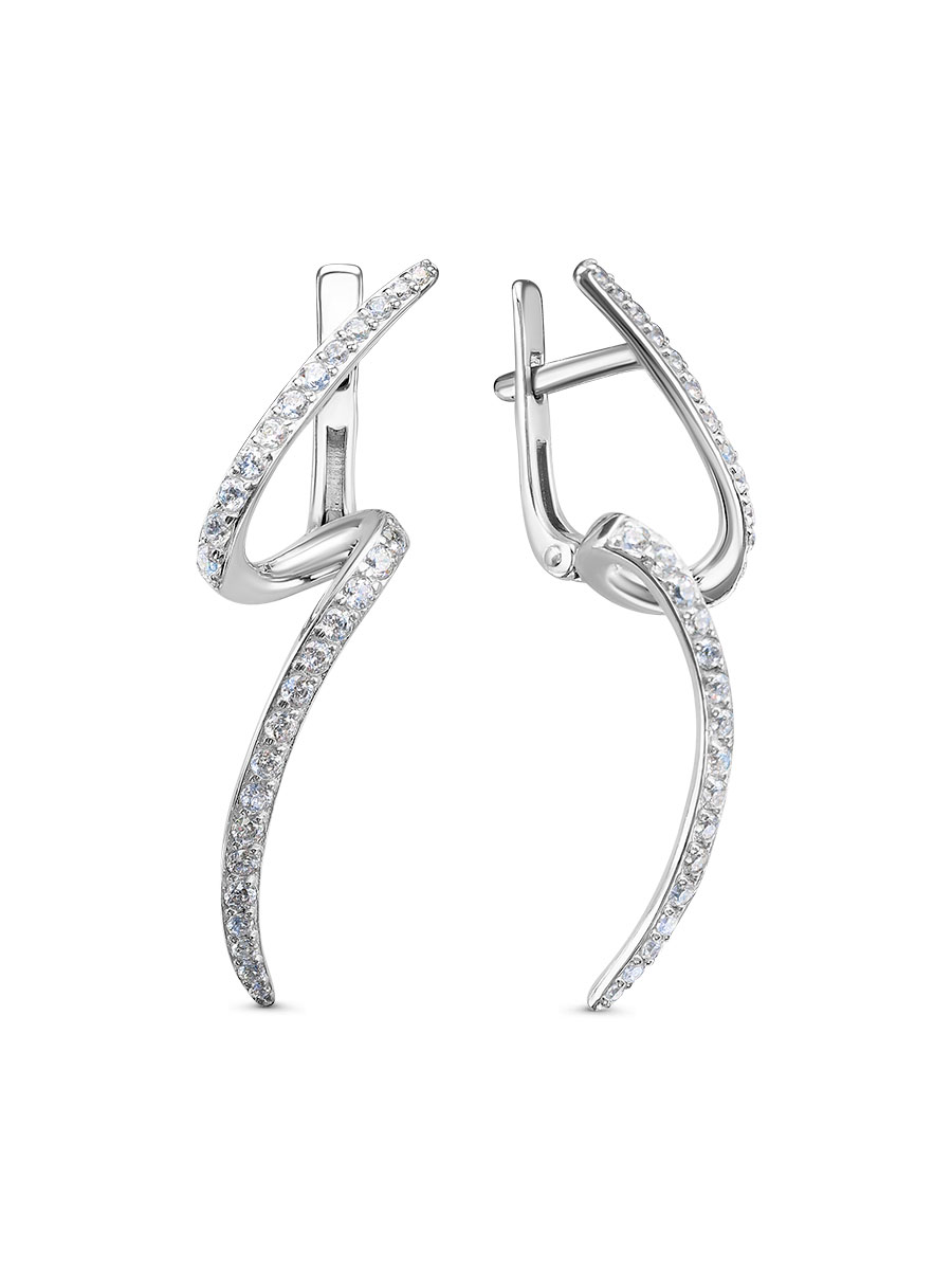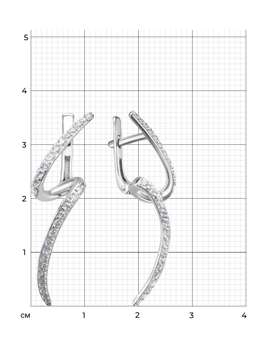 Серьги выполнены из серебра 925 пробы с родиевым покрытием. Характеристики. Вставка 66 недрагоценных бесцветных фианитов 1,5мм огранка круг, 16 недрагоценных бесцветных фианитов 1,25мм огранка круг, 8 недрагоценных бесцветных фианитов 1мм огранка круг. Высота серьги 36мм, ширина 10мм. Замок английский. Рабочая зона штифта 5,5мм, размер занижения штифта 4,5мм. Берегите изделие от воздействия влаги, любых спиртосодержащих растворов и жидкостей, а также парфюма. Для ухода и чистки желательно использовать специальные салфетки для серебра. Приятным дополнением к ювелирному украшению является фирменная упаковка. Значение веса и габаритов в характеристиках примерные и могут отличаться от фактических.