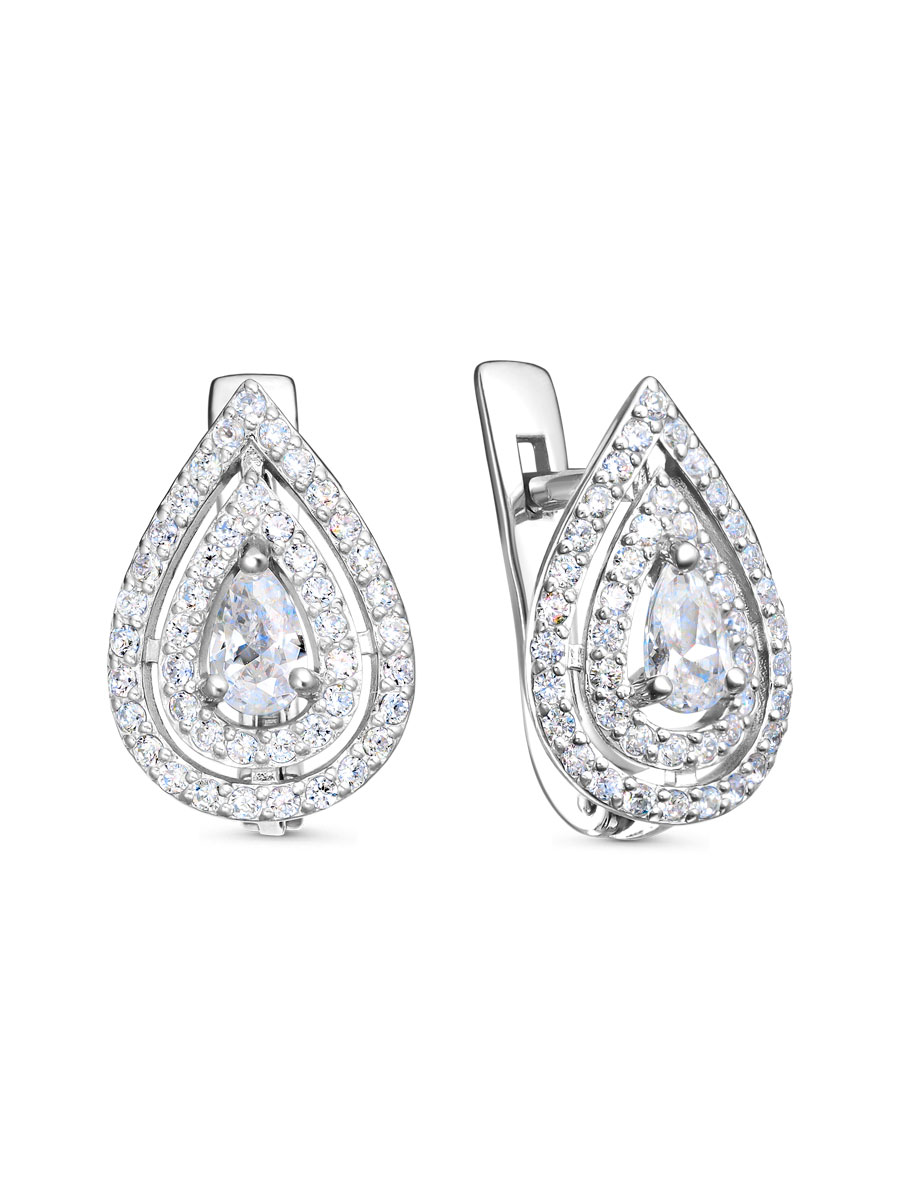 Серьги выполнены из серебра 925 пробы с родиевым покрытием. Характеристики. Вставка 2 недрагоценных бесцветных фианита 5х3 мм огранка груша, 88 недрагоценных бесцветных фианитов 1 мм огранка круг. Высота серьги 14,3 мм, ширина 9,8 мм. Замок английский. Рабочая зона штифта 6,6 мм, размер занижения штифта 2,5 мм. Отличным дополнением к серьгам будет кольцо арт. 1-08-392-12з. Берегите изделие от воздействия влаги, любых спиртосодержащих растворов и жидкостей, а также парфюма. Для ухода и чистки желательно использовать специальные салфетки для серебра. Приятным дополнением к ювелирному украшению является фирменная упаковка. Значение веса и габаритов в характеристиках примерные и могут отличаться от фактических.