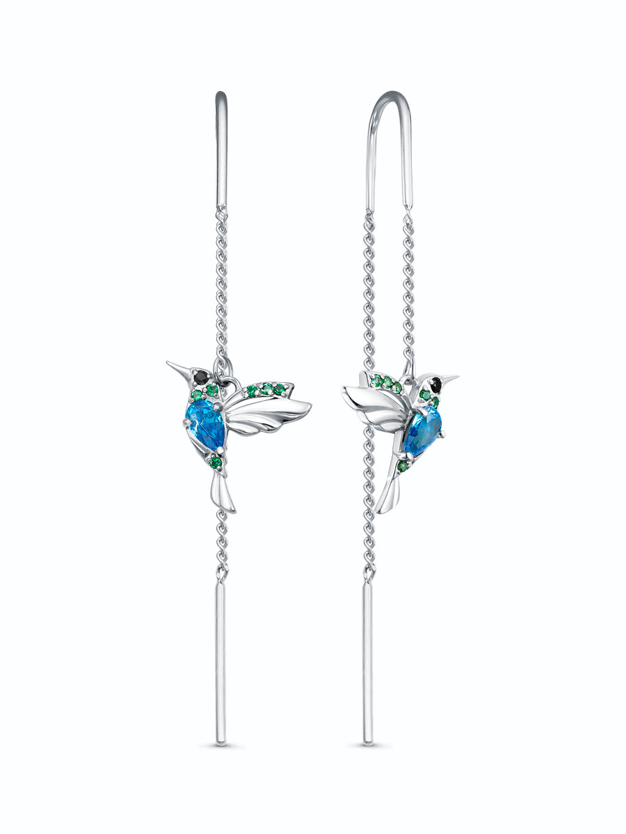 Серьги выполнены из серебра 925 пробы с родиевым покрытием. Характеристики. Вставка 2 недрагоценных фианита 5х3 мм огранка груша, 2 недрагоценных фианита 1,25 мм цвет чёрный огранка круг, 12 наноизумрудов 1 мм огранка круг. Общая высота серьги 57 мм. Высота колибри 12,5 мм, ширина 13,2 мм. Длина палочки 14 мм, толщина 0,9 мм. Толщина крючка 0,9 мм. Внутренний диаметр (рабочая зона штифта) 5,5 мм. Длина цепочки над птицей 17 мм, длина второй цепочки 31 мм. Берегите изделие от воздействия влаги, любых спиртосодержащих растворов и жидкостей, а также парфюма. Для ухода и чистки желательно использовать специальные салфетки для серебра. Приятным дополнением к ювелирному украшению является фирменная упаковка. Значение веса и габаритов в характеристиках примерные и могут отличаться от фактических.