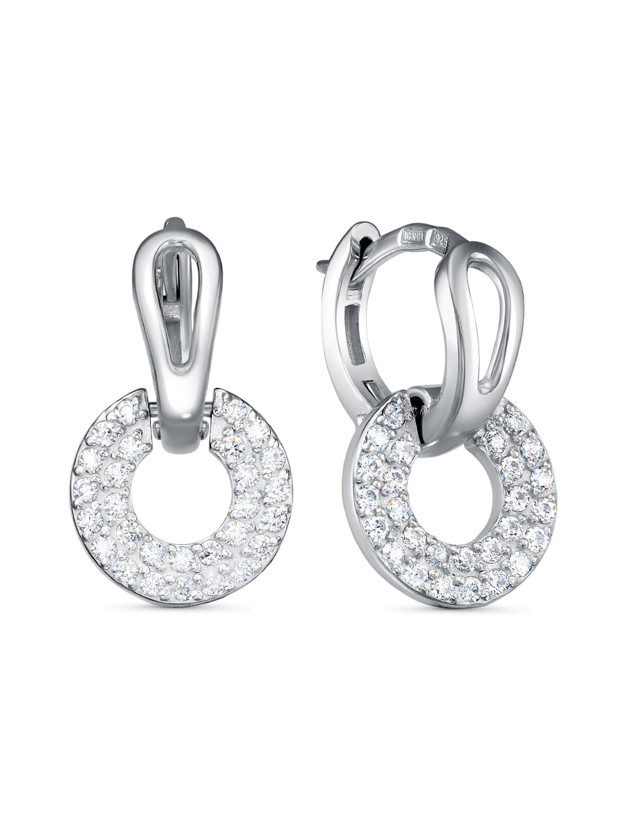 Серьги выполнены из серебра 925 пробы с родиевым покрытием. Характеристики. Вставка 56 недрагоценных бесцветных фианитов 1,25 мм огранка круг. Общая высота серьги 18,5 мм, диаметр подвесной части 11 мм. Рабочая зона штифта 7 мм. Толщина штифта 0,9х1,3 мм. Замок английский. Подвеска несъёмная. Берегите изделие от воздействия влаги, любых спиртосодержащих растворов и жидкостей, а также парфюма. Для ухода и чистки желательно использовать специальные салфетки для серебра. Приятным дополнением к ювелирному украшению является фирменная упаковка. Значения веса и габаритов в характеристиках примерные и могут отличаться от фактических.