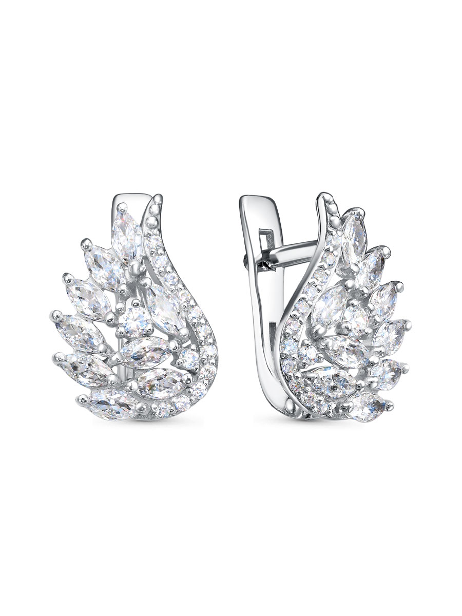 Серьги выполнены из серебра 925 пробы с родиевым покрытием. Характеристики. Вставка 18 недрагоценных бесцветных фианитов 4х2 мм огранка маркиз, 2 недрагоценных бесцветных фианита 2 мм огранка круг, 2 недрагоценных бесцветных фианита 1,25 мм огранка круг, 22 недрагоценных бесцветных фианита 1 мм огранка круг. Высота серьги 14,8 мм, ширина 10,8 мм. Замок английский. Рабочая зона штифта 6 мм. Размер занижения штифта 2,5 мм. Берегите изделие от воздействия влаги, любых спиртосодержащих растворов и жидкостей, а также парфюма. Для ухода и чистки желательно использовать специальные салфетки для серебра. Приятным дополнением к ювелирному украшению является фирменная упаковка. Значение веса и габаритов в характеристиках примерные и могут отличаться от фактических.