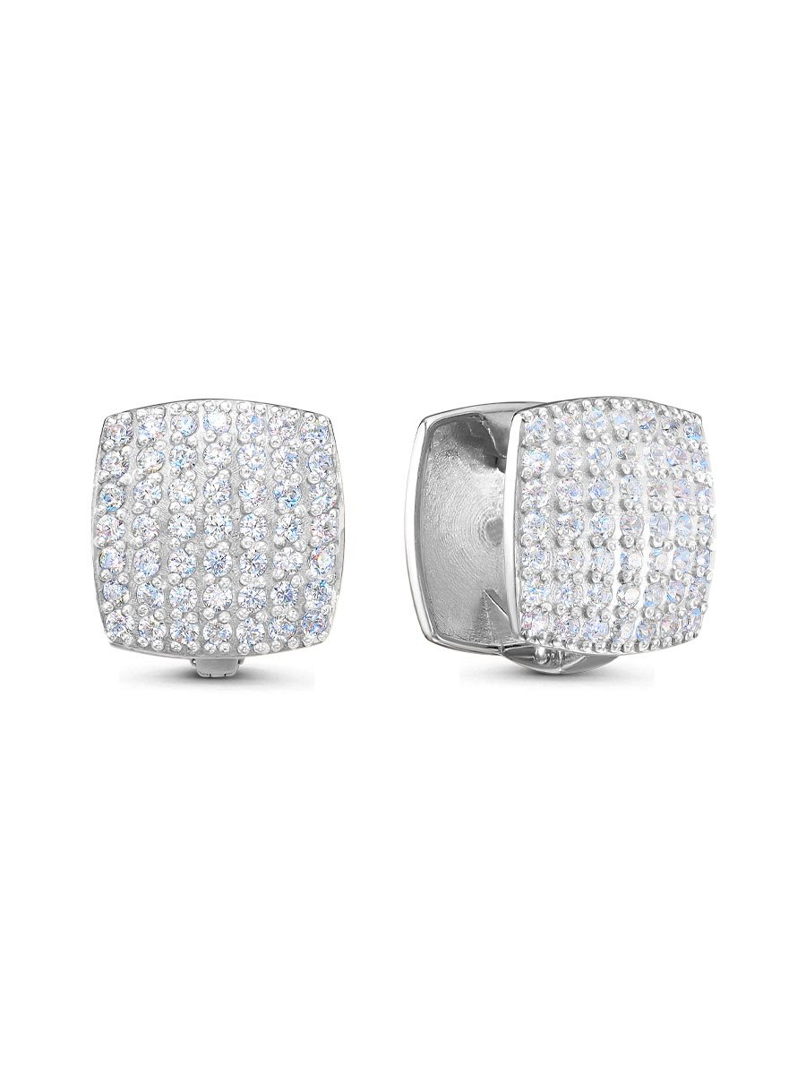 Серьги выполнены из серебра 925 пробы с родиевым покрытием. Характеристики. Вставка 98 недрагоценных бесцветных фианитов 1,25 мм огранка круг. Высота серьги 11,5 мм, ширина 11,5 мм, глубина 11 мм. Замок конго. Рабочая зона штифта 5,7 мм, толщина штифта 1,3х1 мм, размер занижения штифта 1,5 мм. Берегите изделие от воздействия влаги, любых спиртосодержащих растворов и жидкостей, а также парфюма. Для ухода и чистки желательно использовать специальные салфетки для серебра. Приятным дополнением к ювелирному украшению является фирменная упаковка. Значение веса и габаритов в характеристиках примерные и могут отличаться от фактических.