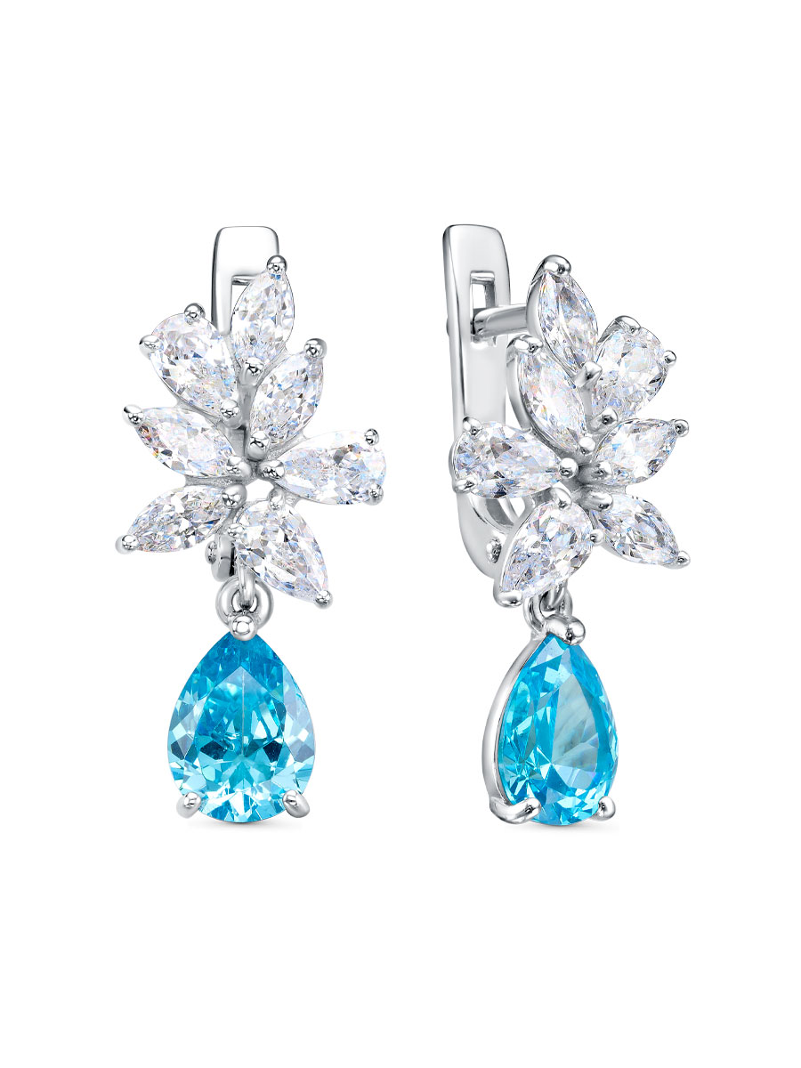 Серьги выполнены из серебра 925 пробы с родиевым покрытием. Характеристики. Вставка 2 недрагоценных фианита 8х6 мм цвет аква огранка груша, 6 недрагоценных бесцветных фианитов 5х3 мм огранка груша, 8 недрагоценных бесцветных фианитов 5х2,5 мм огранка маркиз. Общая высота серьги 23 мм, высота верхней части 15 мм, ширина 11 мм. Замок английский. Рабочая зона штифта 6 мм. Берегите изделие от воздействия влаги, любых спиртосодержащих растворов и жидкостей, а также парфюма. Для ухода и чистки желательно использовать специальные салфетки для серебра. Приятным дополнением к ювелирному украшению является фирменная упаковка. Значение веса и габаритов в характеристиках примерные и могут отличаться от фактических.