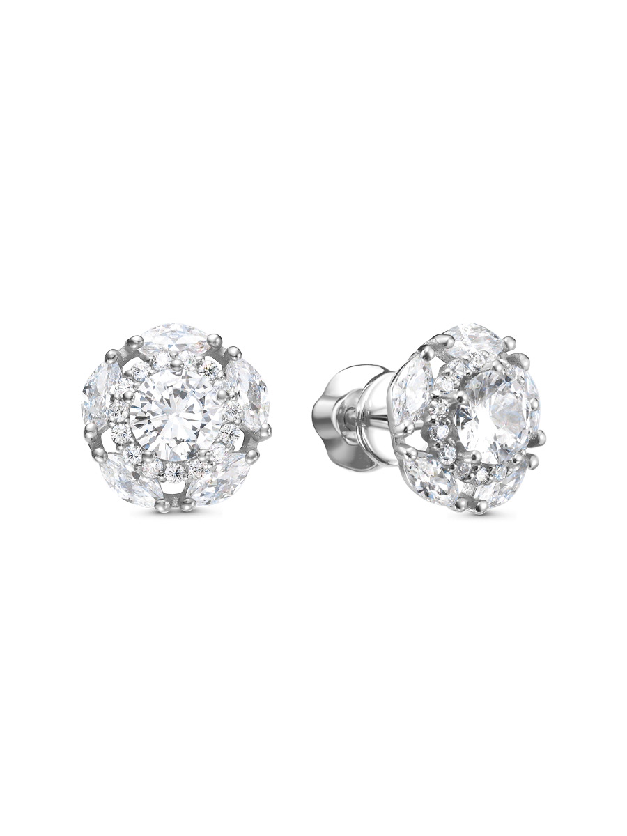 Серьги выполнены из серебра 925 пробы с родиевым покрытием. Характеристики. Вставка 10 недрагоценных бесцветных фианитов 1 мм огранка маркиз, 2 недрагоценных бесцветных фианита 4,5 мм огранка круг, 30 недрагоценных бесцветных фианитов 1 мм огранка круг. Диаметр серьги 9,3 мм, глубина 4 мм. Замок винтовой. Рабочая зона штифта 4,5 мм, толщина штифта 1,2 мм. Берегите изделие от воздействия влаги, любых спиртосодержащих растворов и жидкостей, а также парфюма. Для ухода и чистки желательно использовать специальные салфетки для серебра. Приятным дополнением к ювелирному украшению является фирменная упаковка. Значение веса и габаритов в характеристиках примерные и могут отличаться от фактических.