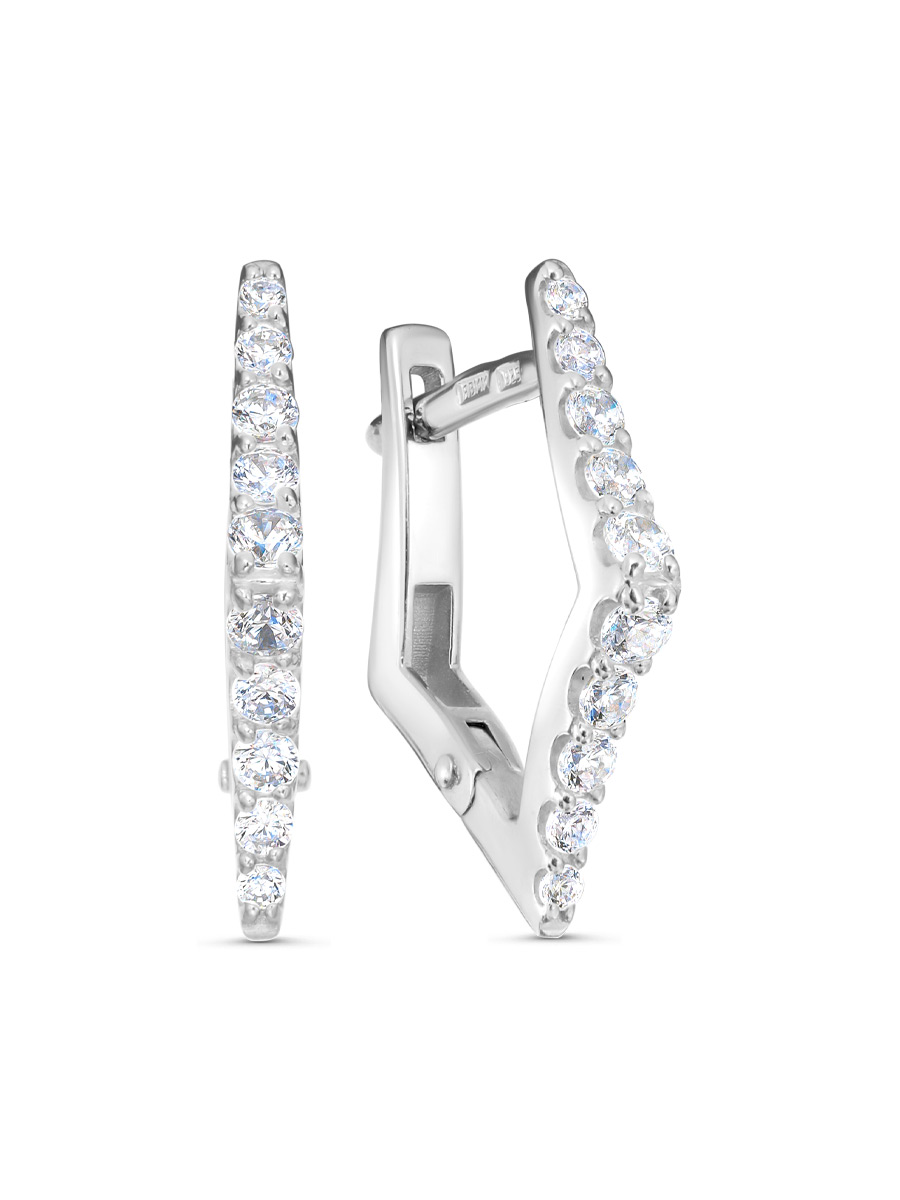 Серьги выполнены из серебра 925 пробы с родиевым покрытием. Характеристики. Вставка 4 недрагоценных бесцветных фианита 2 мм огранка круг, 8 недрагоценных бесцветных фианитов 1,75 мм огранка круг, 4 недрагоценных бесцветных фианита 1,5 мм огранка круг, 4 недрагоценных бесцветных фианита 1,25 мм огранка круг. Высота серьги 17,8 мм, ширина 2 мм, глубина 13,3 мм. Замок английский. Рабочая зона штифта 5,5 мм, толщина штифта 1,3х0,9 мм, размер занижения штифта 2 мм. Берегите изделие от воздействия влаги, любых спиртосодержащих растворов и жидкостей, а также парфюма. Для ухода и чистки желательно использовать специальные салфетки для серебра. Приятным дополнением к ювелирному украшению является фирменная упаковка. Значение веса и габаритов в характеристиках примерные и могут отличаться от фактических.