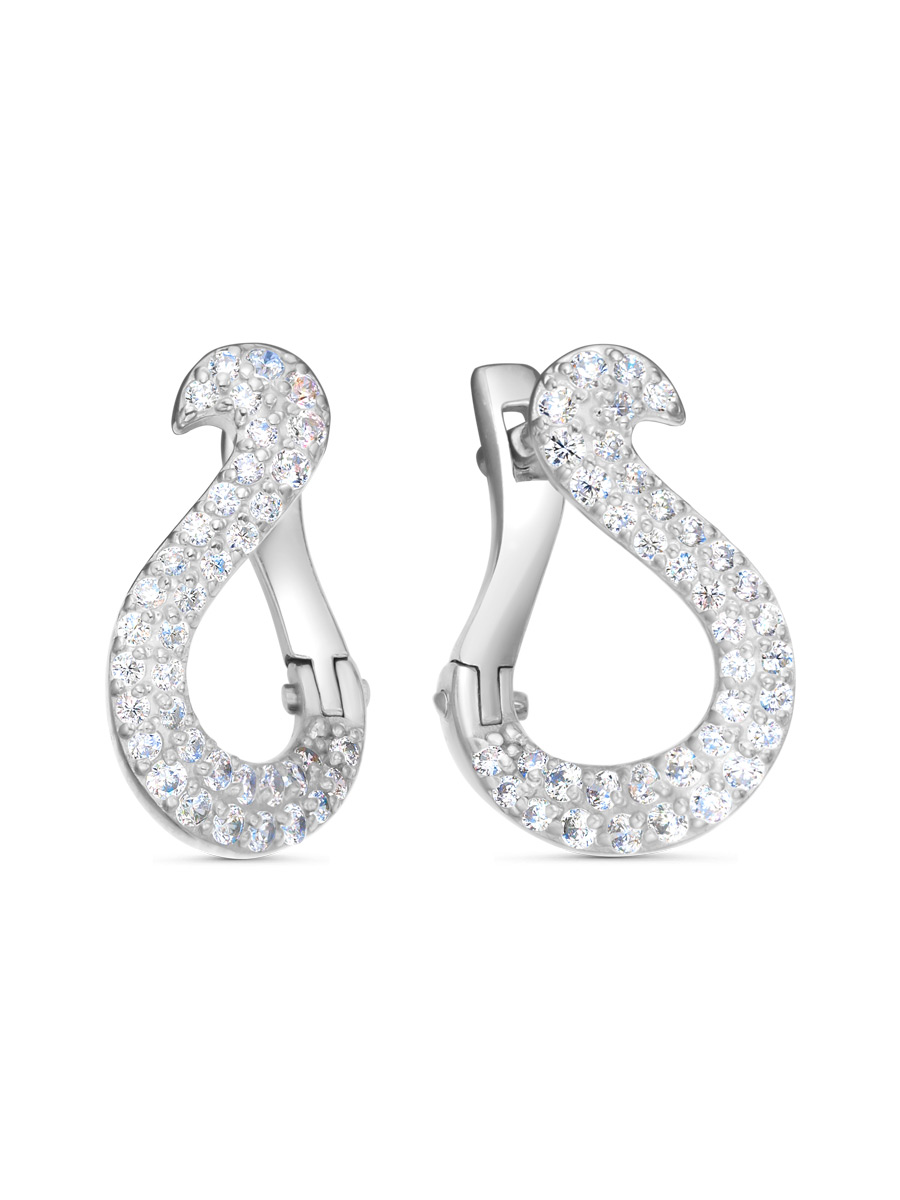 Серьги выполнены из серебра 925 пробы с родиевым покрытием. Характеристики. Вставка 26 недрагоценных бесцветных фианитов 1,25 мм огранка круг, 50 недрагоценных бесцветных фианитов 1 мм огранка круг. Высота серьги 15,5 мм, ширина 9 мм. Замок английский. Рабочая зона штифта 6 мм, толщина штифта 1,2х1 мм, размер занижения штифта 1 мм. Берегите изделие от воздействия влаги, любых спиртосодержащих растворов и жидкостей, а также парфюма. Для ухода и чистки желательно использовать специальные салфетки для серебра. Приятным дополнением к ювелирному украшению является фирменная упаковка. Значение веса и габаритов в характеристиках примерные и могут отличаться от фактических.